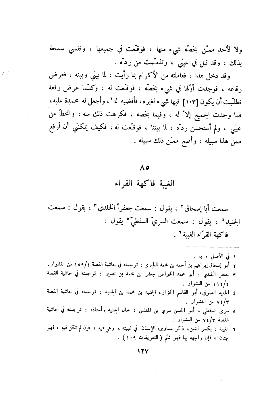 سمعت أبا إسحاق «2» ، يقول: سمعت جعفرا الخلدي «3» ، يقول: سمعت الجنيد «4» ، يقول: سمعت السريّ السقطيّ «5» يقول: