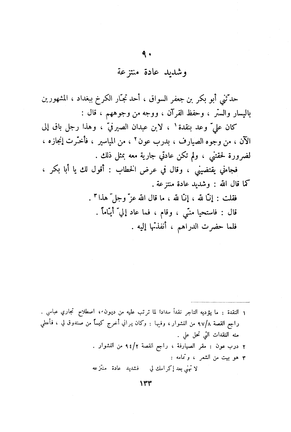 كان عليّ وعد بنقدة «1» ، لابن عبدان الصيرفيّ، وهذا رجل باق إلى الآن، من وجوه الصيارف، بدرب عون «2» ، من المياسير، فأخّرت إنجازه، لضرورة لحقتني، ولم تكن عادتي جارية معه بمثل ذلك.