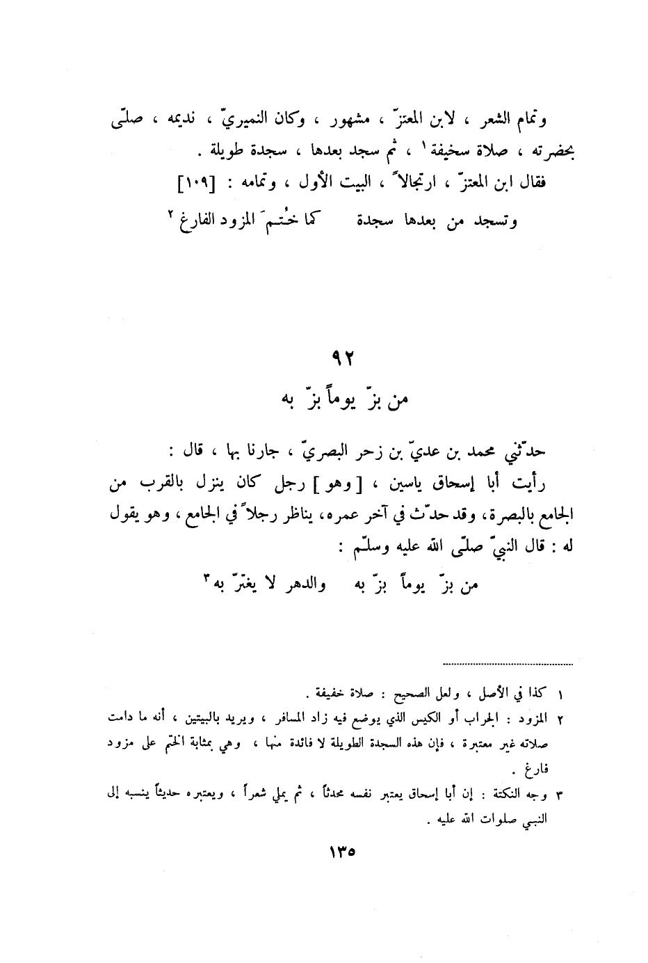 وتمام الشعر، لابن المعتزّ، مشهور، وكان النميريّ، نديمه، صلّى بحضرته، صلاة سخيفة «1» ، ثم سجد بعدها، سجدة طويلة.