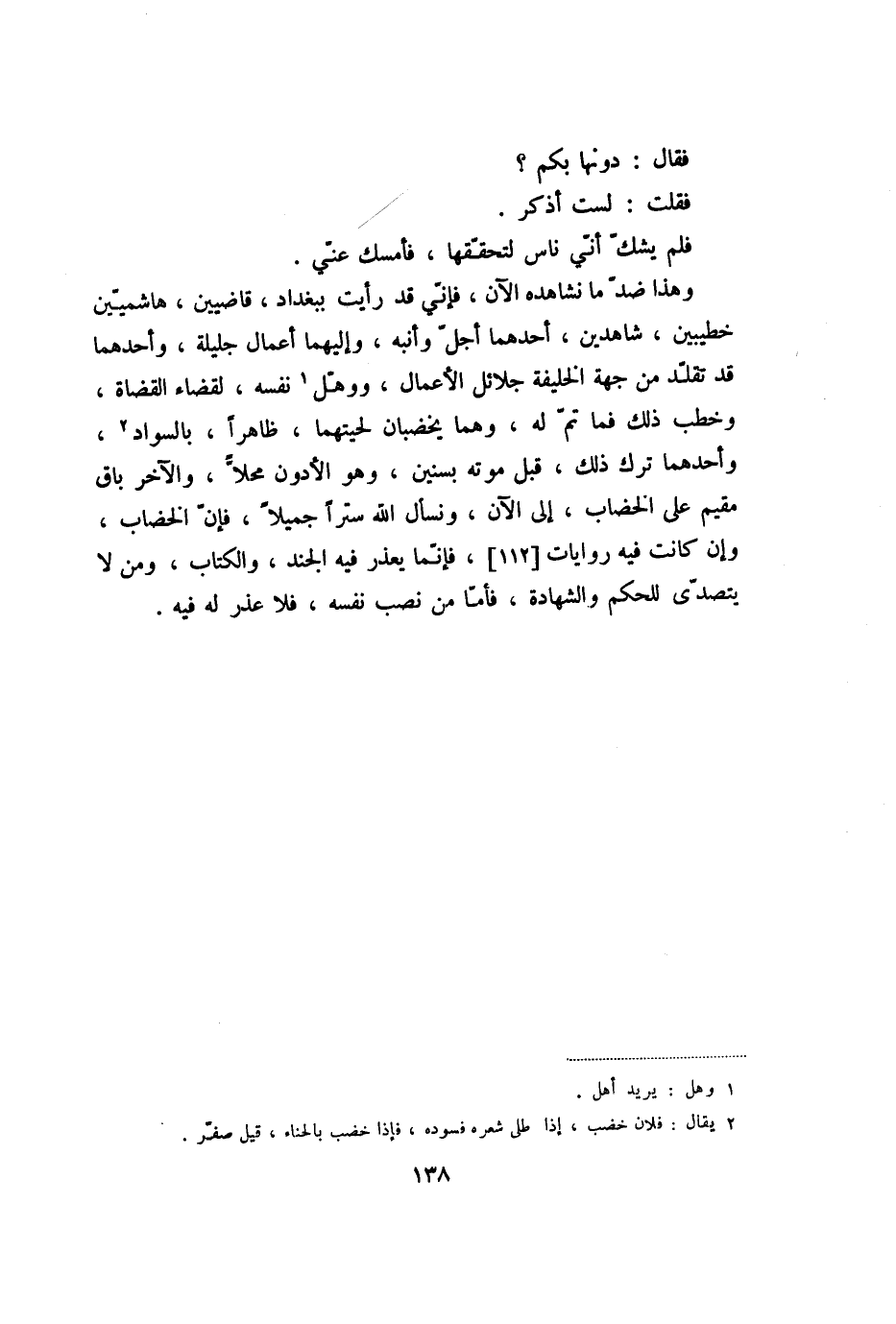 وهذا ضدّ ما نشاهده الآن، فإنّي قد رأيت ببغداد، قاضيين، هاشميّين خطيبين، شاهدين، أحدهما أجلّ وأنبه، وإليهما أعمال جليلة، وأحدهما قد تقلّد من جهة الخليفة جلائل الأعمال، ووهّل «1» نفسه، لقضاء القضاة، وخطب ذلك فما تمّ له، وهما يخضبان لحيتهما، ظاهرا، بالسواد «2» ، وأحدهما ترك ذلك، قبل موته بسنين، وهو الأدون محلّا، والآخر باق مقيم على الخضاب، إلى الآن، ونسأل الله سترا جميلا، فإنّ الخضاب، وإن كانت فيه روايات [112] ، فإنّما يعذر فيه الجند، والكتاب، ومن لا يتصدّى للحكم والشهادة، فأمّا من نصب نفسه، فلا عذر له فيه.