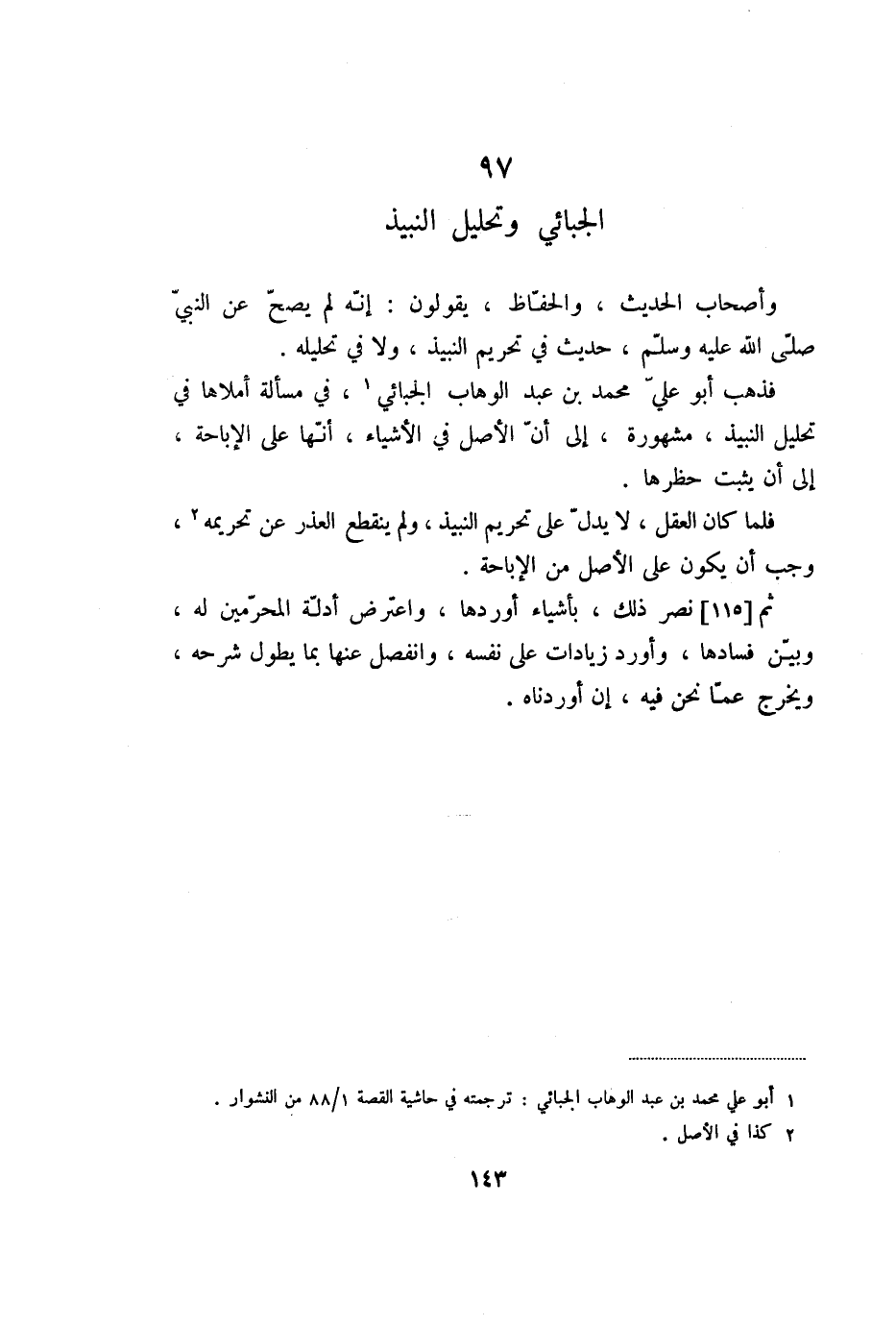 فذهب أبو علي محمد بن عبد الوهاب الجبائي «1» ، في مسألة أملاها في تحليل النبيذ، مشهورة، إلى أنّ الأصل في الأشياء، أنّها على الإباحة، إلى أن يثبت حظرها.