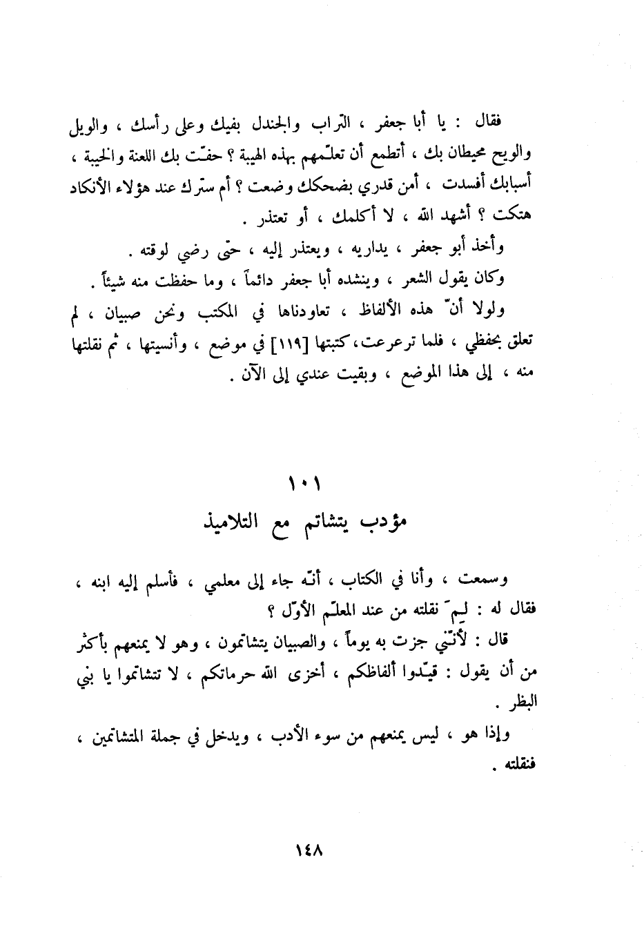 وسمعت، وأنا في الكتاب، أنّه جاء إلى معلمي، فأسلم إليه ابنه، فقال له: لم نقلته من عند المعلّم الأوّل؟