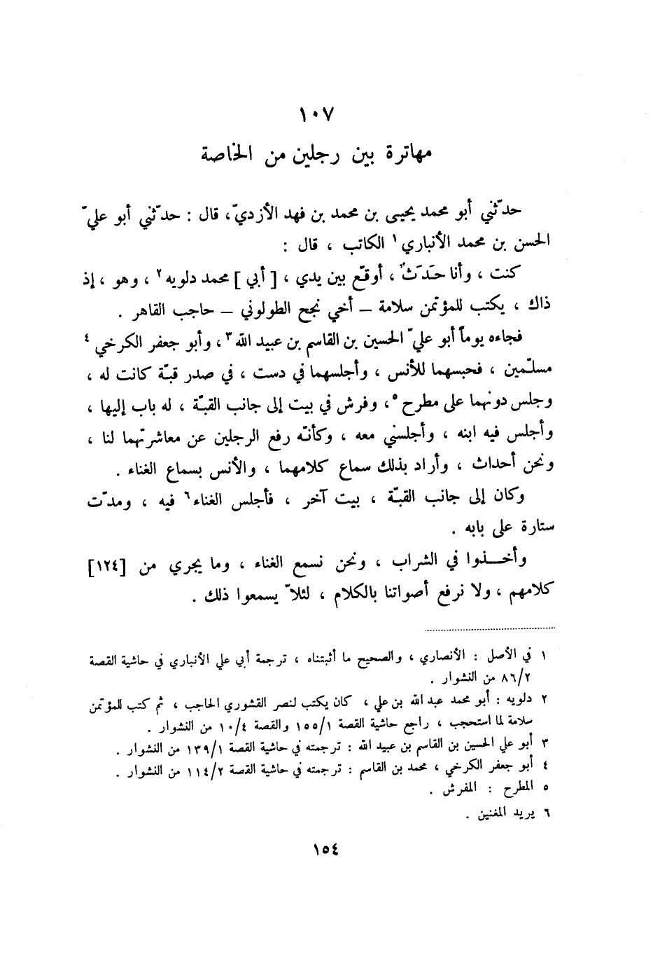 وأخذوا في الشراب، ونحن نسمع الغناء، وما يجري من [124] كلامهم، ولا نرفع أصواتنا بالكلام، لئلّا يسمعوا ذلك.