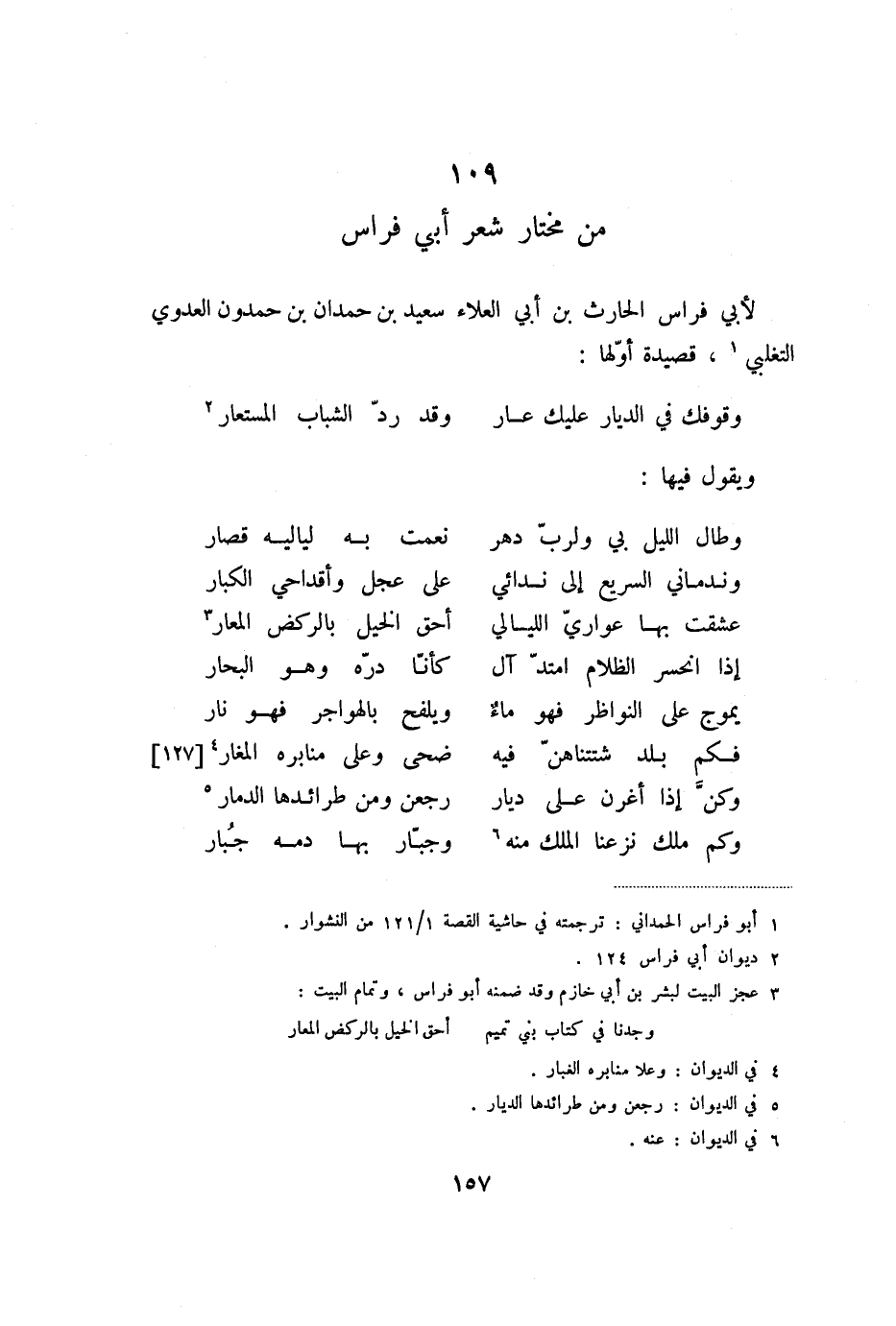 لأبي فراس الحارث بن أبي العلاء سعيد بن حمدان بن حمدون العدوي التغلبي «1» ، قصيدة أوّلها: