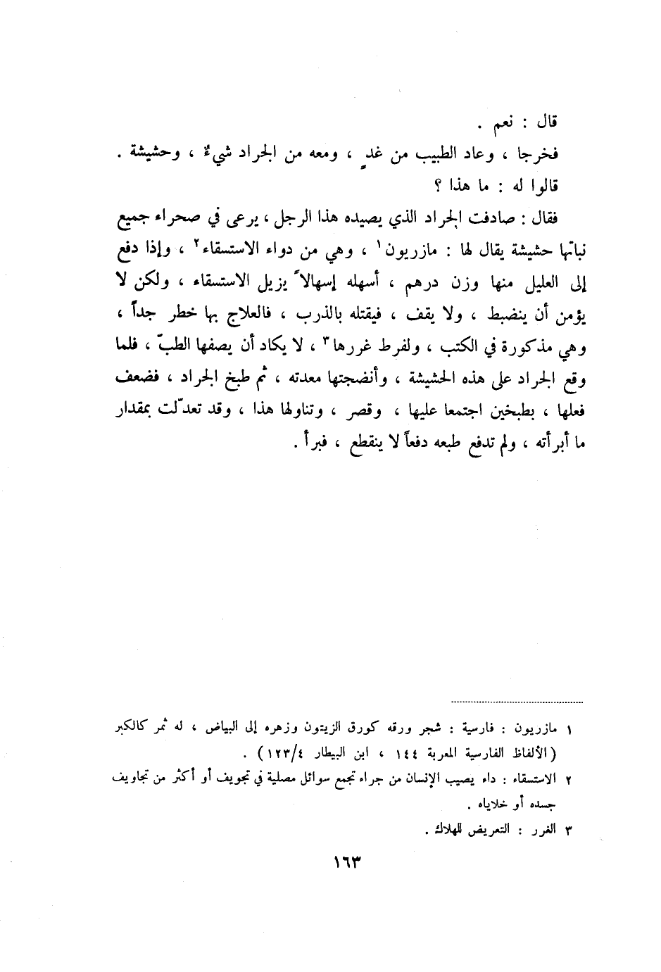 فخرجا، وعاد الطبيب من غد، ومعه من الجراد شيء، وحشيشة.