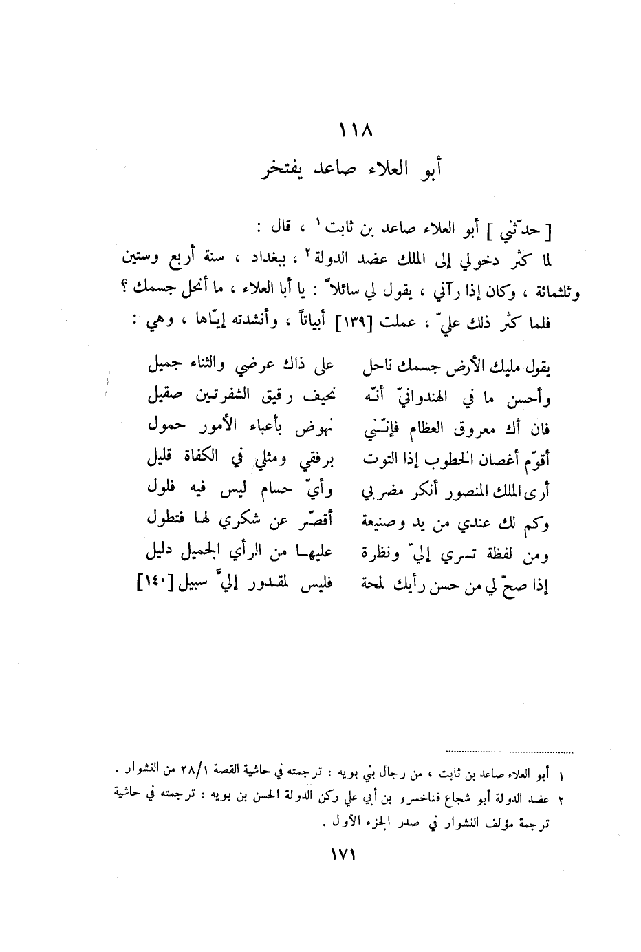 لما كثر دخولي إلى الملك عضد الدولة «2» ، ببغداد، سنة أربع وستين وثلاثمائة، وكان إذا رآني، يقول لي سائلا: يا أبا العلاء، ما أنحل جسمك؟
