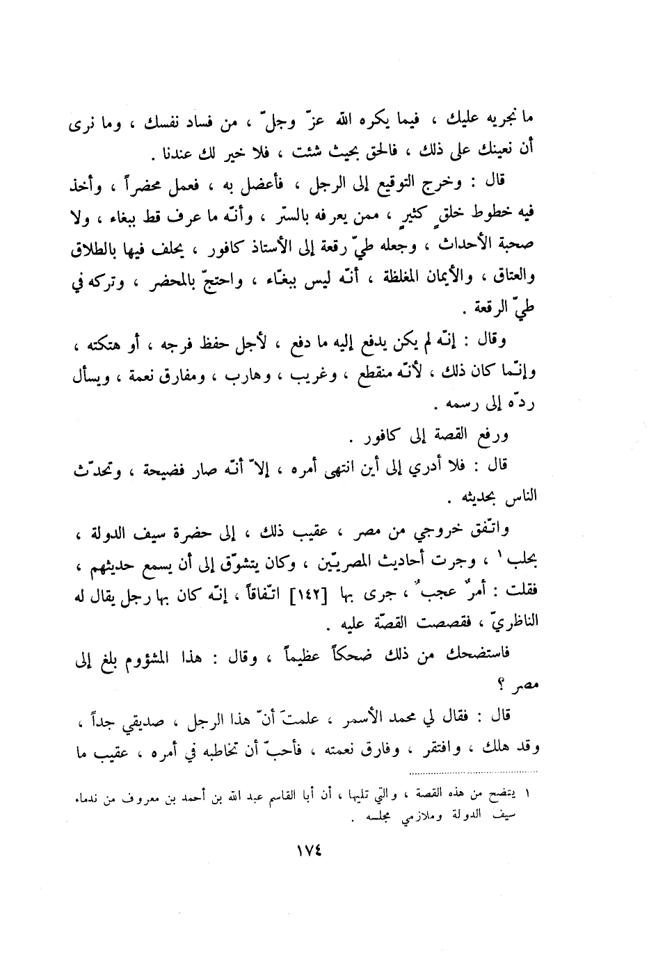 واتّفق خروجي من مصر، عقيب ذلك، إلى حضرة سيف الدولة، بحلب «1» ، وجرت أحاديث المصريّين، وكان يتشوّق إلى أن يسمع حديثهم، فقلت: أمر عجب، جرى بها [142] اتّفاقا، إنّه كان بها رجل يقال له الناظريّ، فقصصت القصّة عليه.