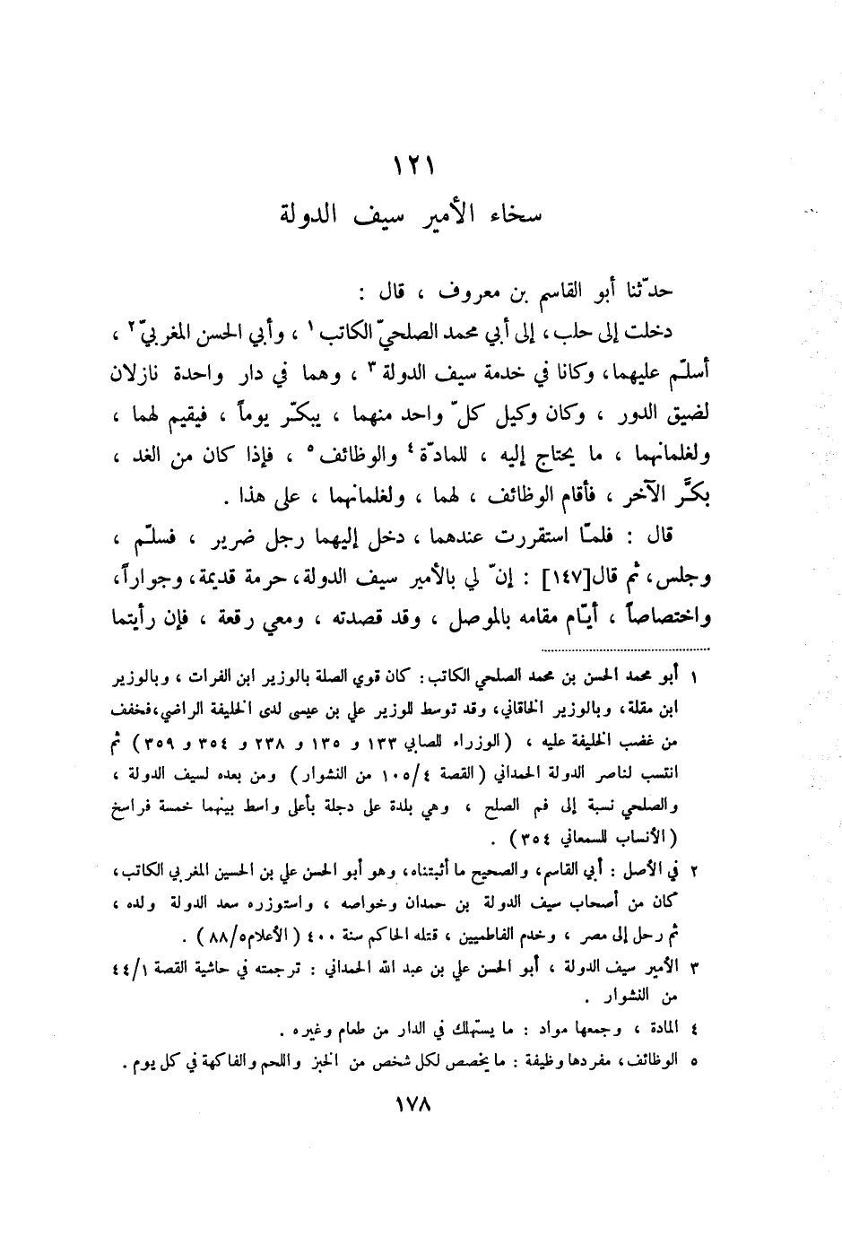 دخلت إلى حلب، إلى أبي محمد الصلحيّ الكاتب «1» ، وأبي الحسن المغربيّ «2» ، أسلّم عليهما، وكانا في خدمة سيف الدولة «3» ، وهما في دار واحدة نازلان لضيق الدور، وكان وكيل كلّ واحد منهما، يبكّر يوما، فيقيم لهما، ولغلمانهما، ما يحتاج إليه، للمادّة «4» والوظائف «5» ، فإذا كان من الغد، بكّر الآخر، فأقام الوظائف، لهما، ولغلمانهما، على هذا.
