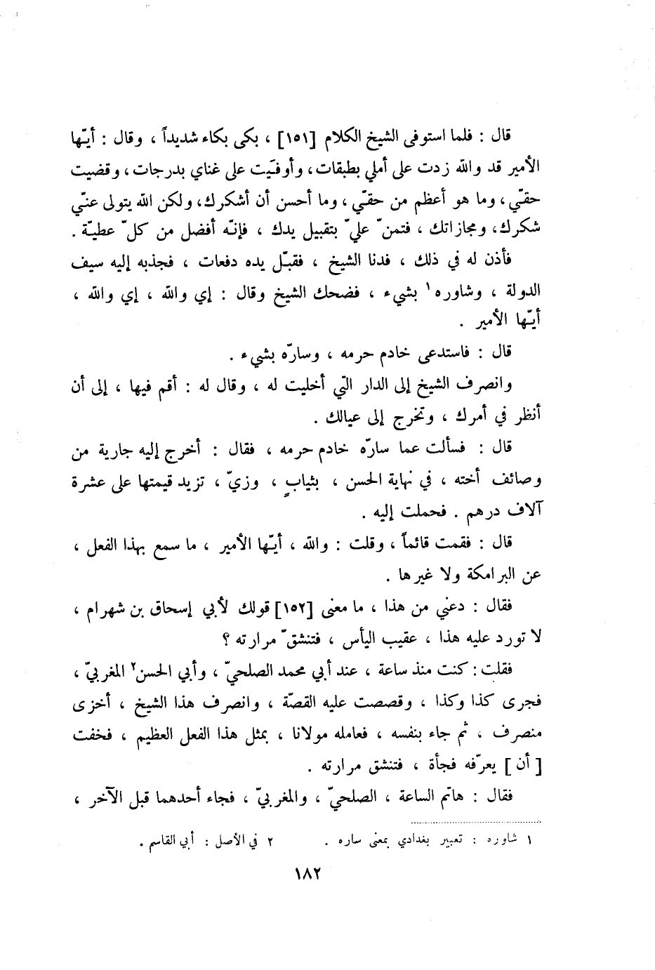قال: فلما استوفى الشيخ الكلام [151] ، بكى بكاء شديدا، وقال: أيّها الأمير قد والله زدت على أملي بطبقات، وأوفيت على غناي بدرجات، وقضيت حقّي، وما هو أعظم من حقّي، وما أحسن أن أشكرك، ولكن الله يتولى عنّي شكرك، ومجازاتك، فتمنّ عليّ بتقبيل يدك، فإنّه أفضل من كلّ عطيّة.