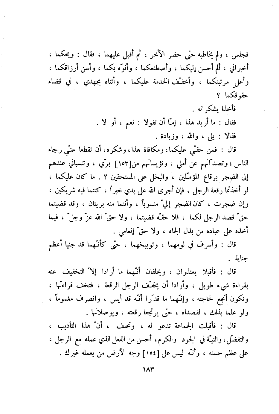 قال: فمن حقّي عليكما، ومكافاة هذا، وشكره، أن تقطعا عنّي رجاء الناس؛ وتصدّانهم عن أملي، وتؤيسانهم من [153] برّي، وتنسباني عندهم إلى الضجر برقاع المؤمّلين، والبخل على المستحقين؟. ما كان عليكما، لو أخذتما رقعة الرجل، فإن أجرى الله على يدي خيرا، كنتما فيه شريكين، وإن ضجرت، كان الضجر إليّ منسوبا، وأنتما منه بريئان، وقد قضيتما حقّ قصد الرجل لكما، فلا حقّه قضيتما، ولا حقّ الله عزّ وجلّ، فيما أخذه على عباده من بذل الجاه، ولا حقّ إنعامي.