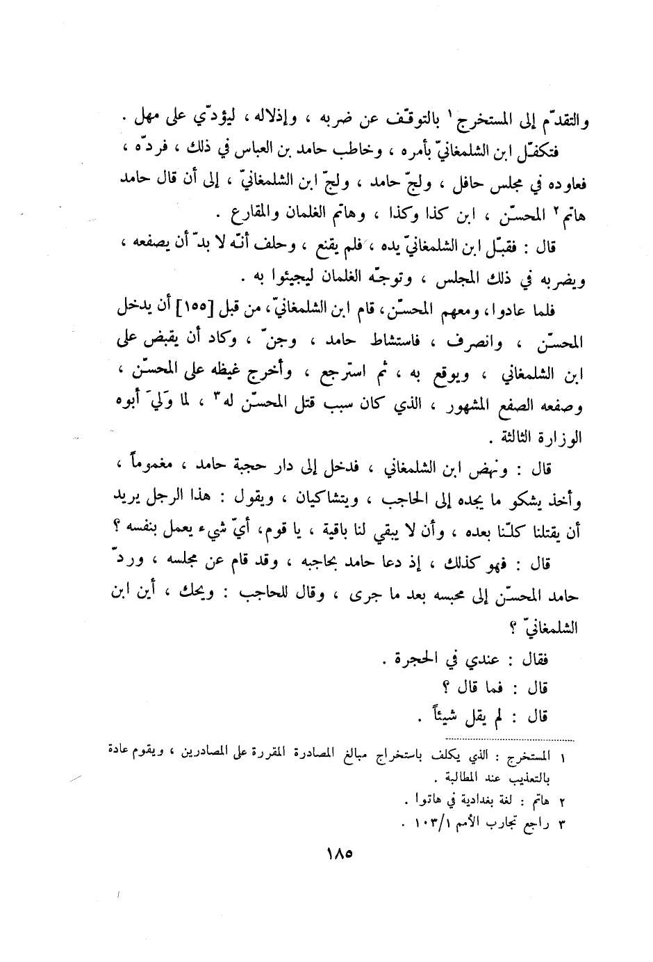 فتكفّل ابن الشلمغانيّ بأمره، وخاطب حامد بن العباس في ذلك، فردّه، فعاوده في مجلس حافل، ولجّ حامد، ولجّ ابن الشلمغانيّ، إلى أن قال حامد هاتم «2» المحسّن، ابن كذا وكذا، وهاتم الغلمان والمقارع.