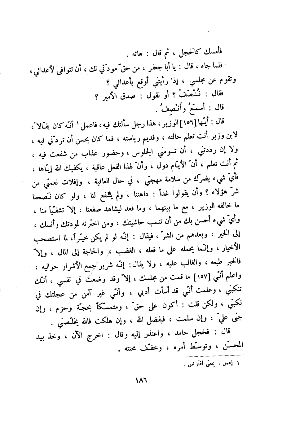 قال: أيّها [156] الوزير، هذا رجل سألتك فيه، فاعمل «1» أنّه كان بقّالا، لابن وزير أنت تعلم حالته، وقديم رياسته، فما كان يحسن أن تردّني فيه، ولا إن رددتني، أن تسومني الجلوس، وحضور عذاب من شفعت فيه، ثم أنت تعلم، أنّ الأيّام دول، وأنّ لهذا الفعل عاقبة، يكفيك الله إيّاها، فأيّ شيء يضرّك من سلامة مهجتي، في حال العافية، وإفلات نعمتي من شرّ هؤلاء؟ وأن يقولوا غدا: داهننا، ولم يشفع لنا، ولو كان نصحنا ما خالفه الوزير، مع ما بينهما، وما قعد ليشاهد صفعنا، إلّا تشفّيا منا، وأيّ شيء أحسن بك من أن تنسب حاشيتك، ومن اخترته لمودتك وأنسك، إلى الخير، وبعدهم من الشرّ، فيقال: إنّه لو لم يكن خيّرا، لما استصحب الأخيار، وإنّما يحمله على ما فعله، الغضب، والحاجة إلى المال، وإلّا فالخير طبعه، والغالب عليه، ولا يقال: إنّه شرير جمع الأشرار حواليه، واعلم أنّي [157] ما قمت من مجلسك، إلّا وقد وضعت في نفسي، أنّك تنكبني، وعلمت أنّي قد أسأت أدبي، وأنّي غير آمن من عجلتك في نكبتي، ولكن قلت: أكون على حقّ، ومتمسّكا بحجّة وحزم، وإن جنى عليّ، وإن سلمت، فبفضل الله، وإن هلكت فالله يخلّصني.