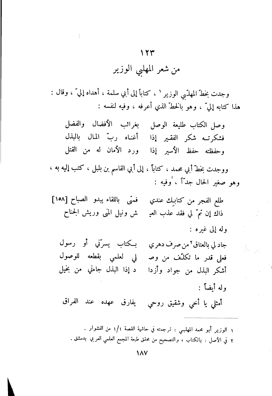 وجدت بخطّ المهلّبي الوزير «1» ، كتابا إلى أبي سلمة، أهداه إليّ، وقال: