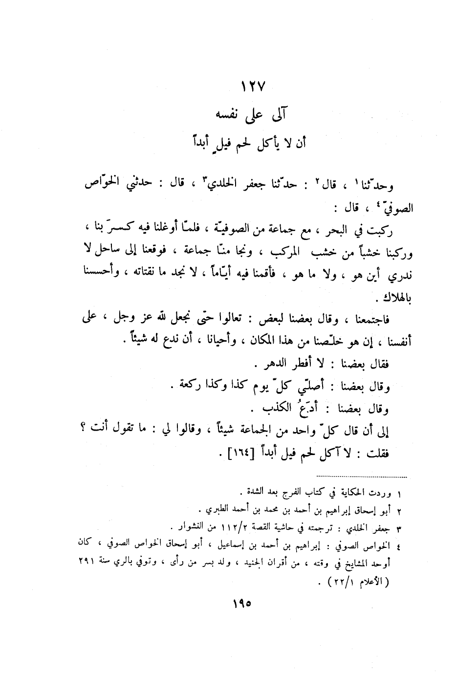 وحدّثنا «1» ، قال «2» : حدّثنا جعفر الخلدي «3» ، قال: حدثني الخوّاص الصوفيّ «4» ، قال:
