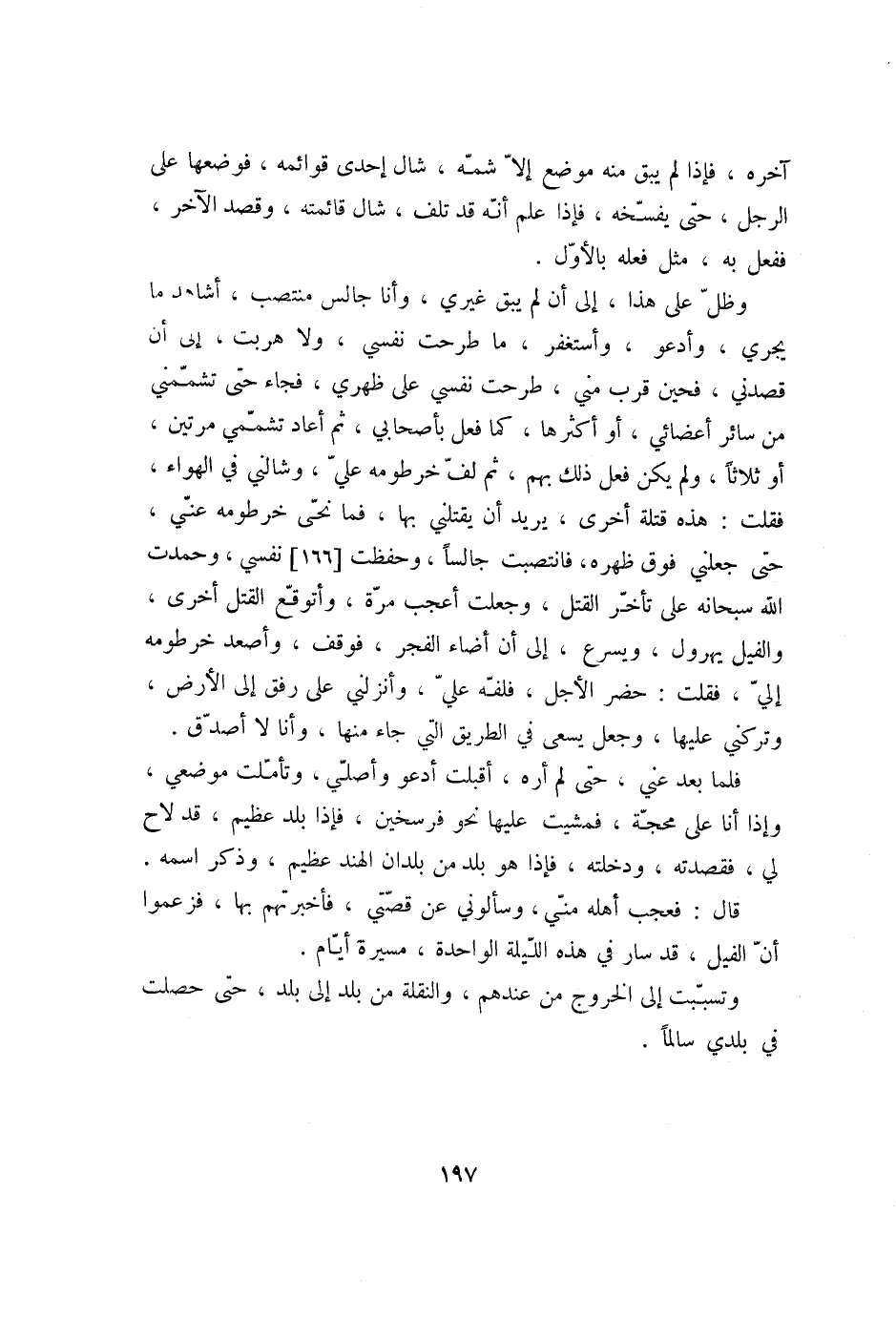 وظلّ على هذا، إلى أن لم يبق غيري، وأنا جالس منتصب، أشاهد ما يجري، وأدعو، وأستغفر، ما طرحت نفسي، ولا هربت، إلى أن قصدني، فحين قرب مني، طرحت نفسي على ظهري، فجاء حتى تشمّمني من سائر أعضائي، أو أكثرها، كما فعل بأصحابي، ثم أعاد تشمّمي مرتين، أو ثلاثا، ولم يكن فعل ذلك بهم، ثم لفّ خرطومه عليّ، وشالني في الهواء، فقلت: هذه قتلة أخرى، يريد أن يقتلني بها، فما نحّى خرطومه عنّي، حتى جعلني فوق ظهره، فانتصبت جالسا، وحفظت [166] نفسي، وحمدت الله سبحانه على تأخرّ القتل، وجعلت أعجب مرّة، وأتوقّع القتل أخرى، والفيل يهرول، ويسرع، إلى أن أضاء الفجر، فوقف، وأصعد خرطومه إليّ، فقلت: حضر الأجل، فلفّه عليّ، وأنزلني على رفق إلى الأرض، وتركني عليها، وجعل يسعى في الطريق التي جاء منها، وأنا لا أصدّق.