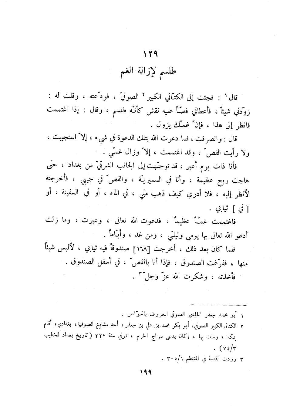 فأنا ذات يوم أعبر، قد توجّهت إلى الجانب الشرقيّ من بغداد، حتى هاجت ريح عظيمة، وأنا في السميريّة، والفصّ في جيبي، فأخرجته لأنظر إليه، فلا أدري كيف ذهب مني، في الماء، أو في السفينة، أو [في] ثيابي.