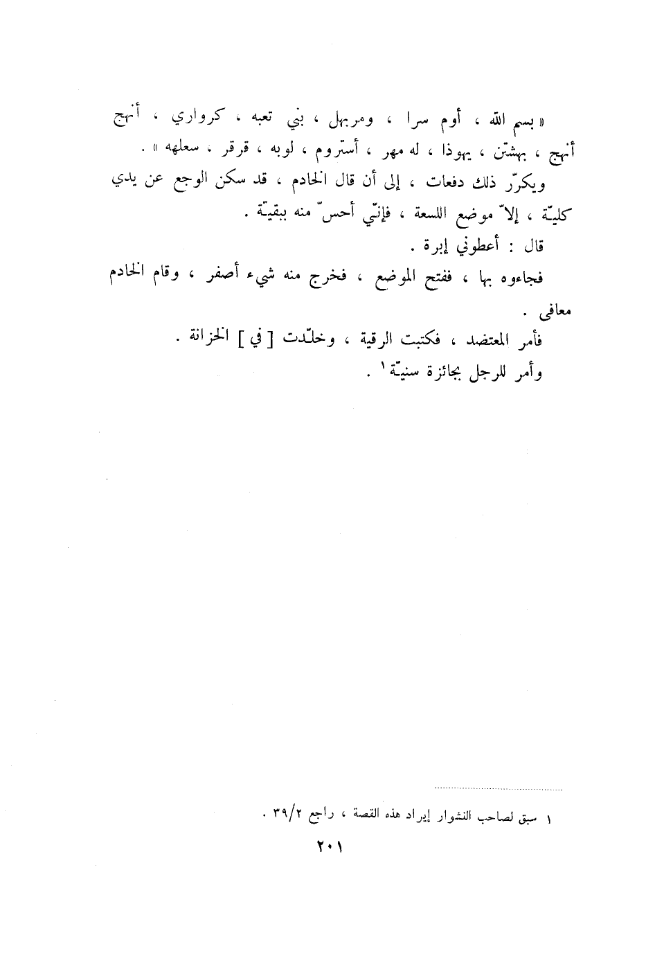 ويكرّر ذلك دفعات، إلى أن قال الخادم، قد سكن الوجع عن يدي كليّة، إلّا موضع اللسعة، فإنّي أحسّ منه ببقيّة.