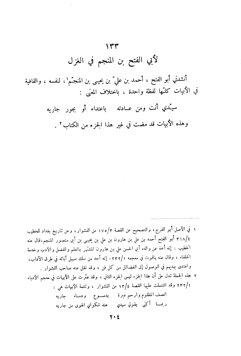 أنشدني أبو الفتح، أحمد بن عليّ بن يحيى بن المنجّم «1» ، لنفسه، والقافية في الأبيات كلّها لفظة واحدة، باختلاف المعنى: