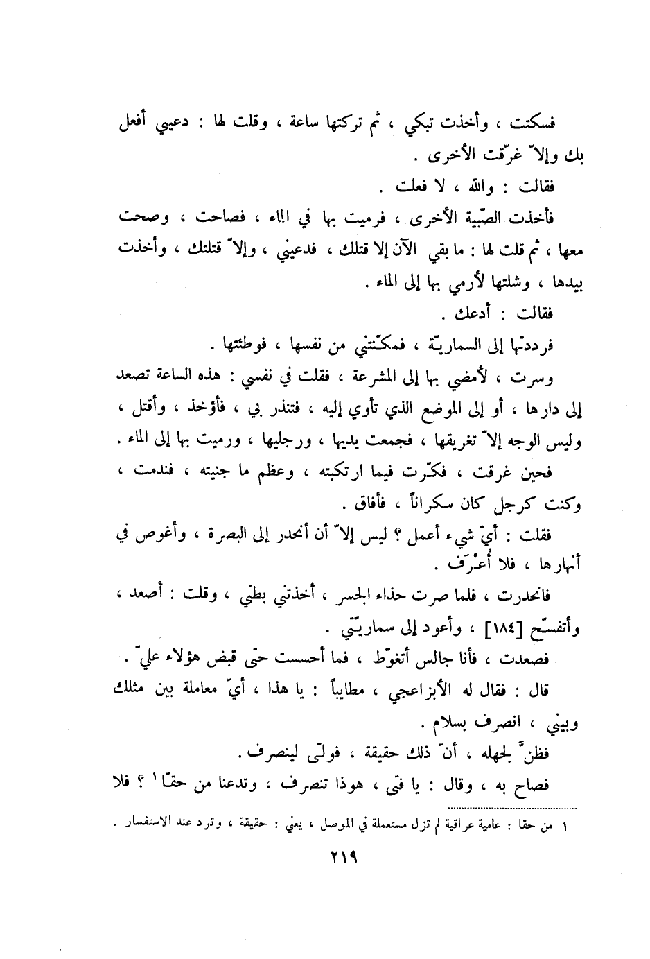 وسرت، لأمضي بها إلى المشرعة، فقلت في نفسي: هذه الساعة تصعد إلى دارها، أو إلى الموضع الذي تأوي إليه، فتنذر بي، فأؤخذ، وأقتل، وليس الوجه إلّا تغريقها، فجمعت يديها، ورجليها، ورميت بها إلى الماء.