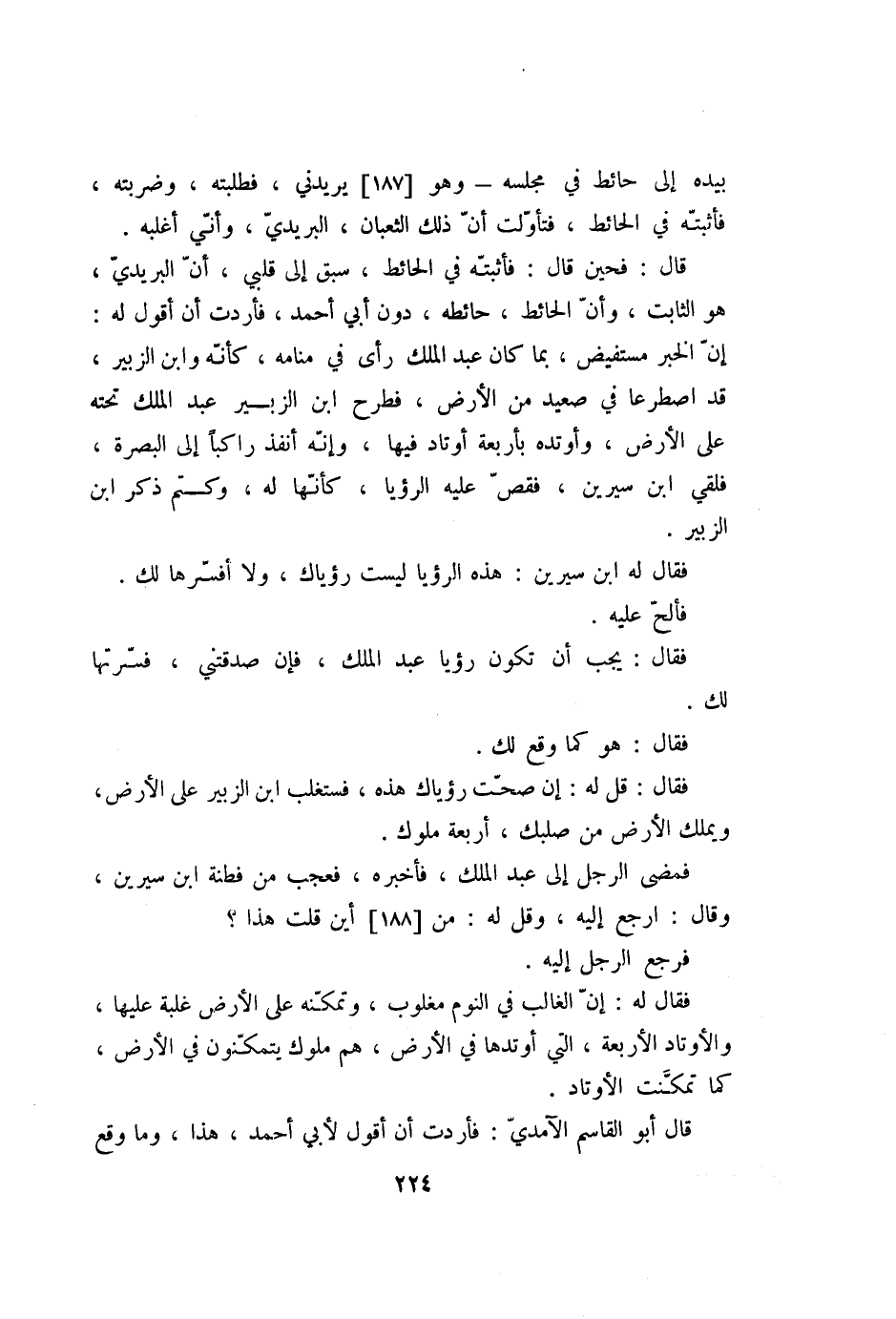 فمضى الرجل إلى عبد الملك، فأخبره، فعجب من فطنة ابن سيرين، وقال: ارجع إليه، وقل له: من [188] أين قلت هذا؟