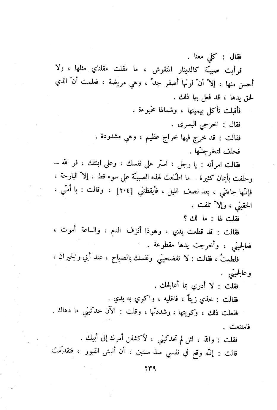 فقالت امرأته: يا رجل، استر على نفسك، وعلى ابنتك، فو الله- وحلفت بأيمان كثيرة- ما اطّلعت لهذه الصبيّة على سوء قط، إلّا البارحة، فإنّها جاءتني، بعد نصف الليل، فأيقظتني [204] ، وقالت: يا أمّي، الحقيني، وإلّا تلفت.