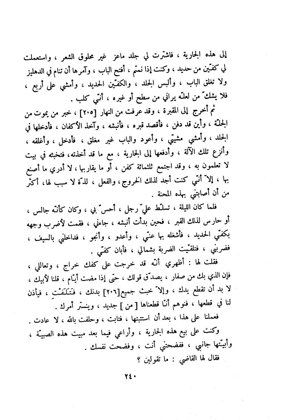 ثم أخرج إلى المقبرة، وقد عرفت من النهار [205] ، خبر من يموت من الجلّة، وأين قد دفن، فأقصد قبره، فأنبشه، وآخذ الأكفان، فأدخلها في الجلد، وأمشي مشيتي، وأعود والباب غير مغلق، فأدخل، وأغلقه، وأنزع تلك الآلة، وأدفعها إلى الجارية، مع ما قد أخذته، فتخبئه في بيت لا تعلمون به، وقد اجتمع ثلاثمائة كفن، أو ما يقاربها، لا أدري ما أصنع بها، إلّا أنّي كنت أجد لذلك الخروج، والفعل، لذّة لا سبب لها، أكثر من أن أصابتني بهذه المحنة.