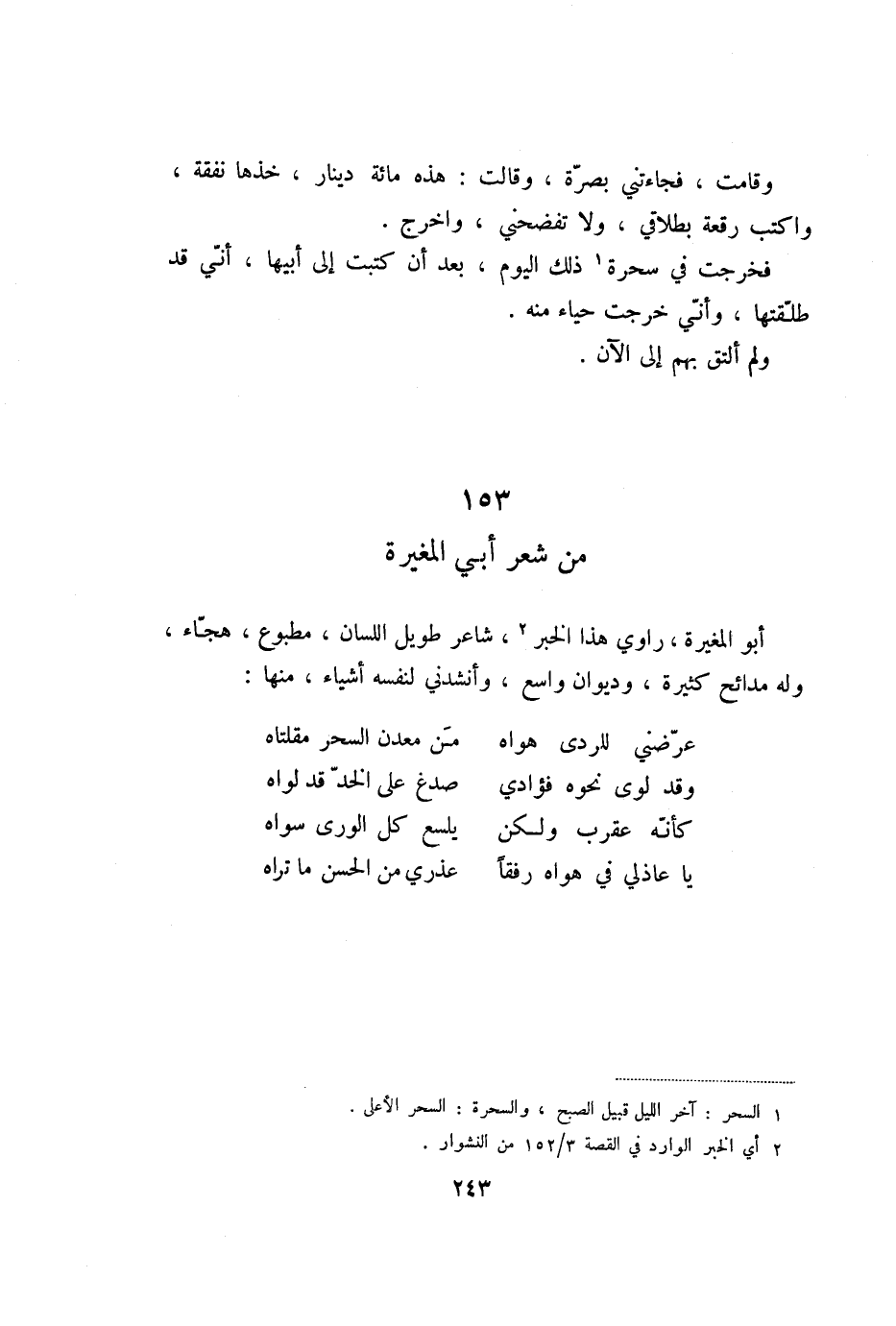 فخرجت في سحرة «1» ذلك اليوم، بعد أن كتبت إلى أبيها، أنّي قد طلّقتها، وأنّي خرجت حياء منه.