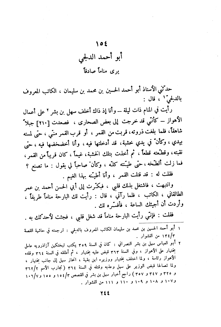 وانتبهت، فاشتغل بذلك قلبي، فبكّرت إلى أبي الحسن أحمد بن عمر الطالقاني، الكاتب، فلما رآني، قال: رأيت لك البارحة مناما طريفا، وأردت أن أجيئك الساعة، فأفسّره لك.