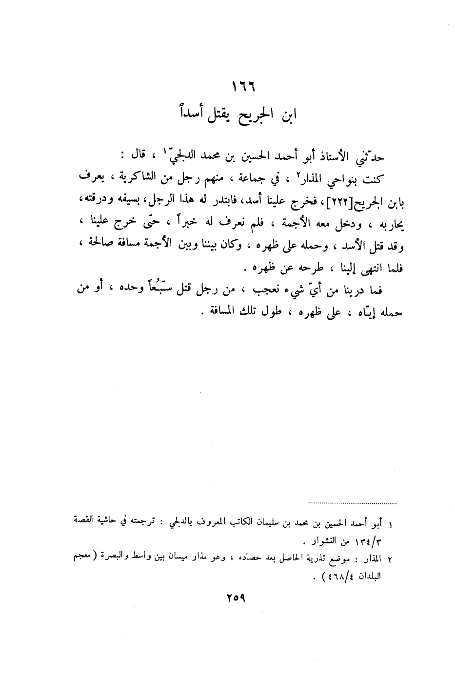 كنت بنواحي المذار «2» ، في جماعة، منهم رجل من الشاكرية، يعرف بابن الجريح [222] ، فخرج علينا أسد، فابتدر له هذا الرجل، بسيفه ودرقته، يحاربه، ودخل معه الأجمة، فلم نعرف له خبرا، حتى خرج علينا، وقد قتل الأسد، وحمله على ظهره، وكان بيننا وبين الأجمة مسافة صالحة، فلما انتهى إلينا، طرحه عن ظهره.