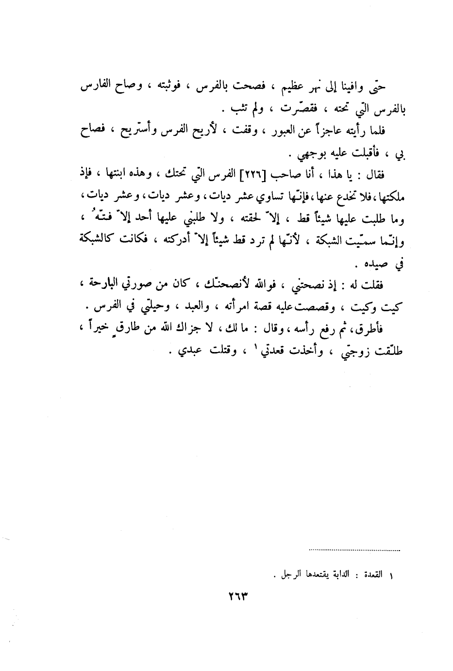 فقال: يا هذا، أنا صاحب [226] الفرس التي تحتك، وهذه ابنتها، فإذ ملكتها، فلا تخدع عنها، فإنّها تساوي عشر ديات، وعشر ديات، وعشر ديات، وما طلبت عليها شيئا قط، إلّا لحقته، ولا طلبني عليها أحد إلّا فتّه، وإنّما سمّيت الشبكة، لأنّها لم ترد قط شيئا إلّا أدركته، فكانت كالشبكة في صيده.
