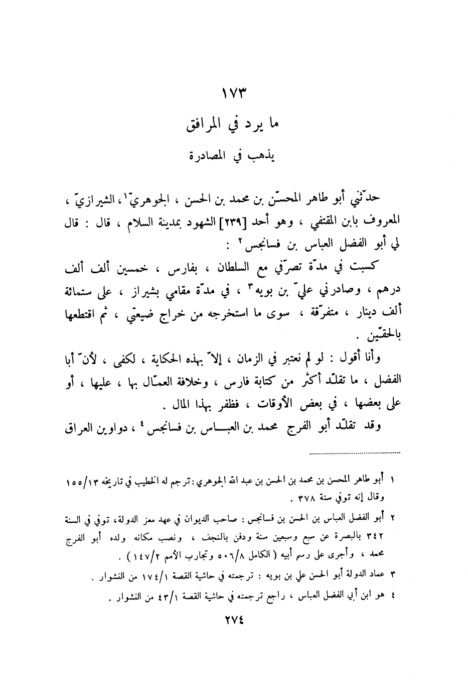 حدّثني أبو طاهر المحسّن بن محمد بن الحسن، الجوهريّ «1» ، الشيرازيّ، المعروف بابن المقتفي، وهو أحد [239] الشهود بمدينة السلام، قال: قال لي أبو الفضل العباس بن فسانجس «2» :