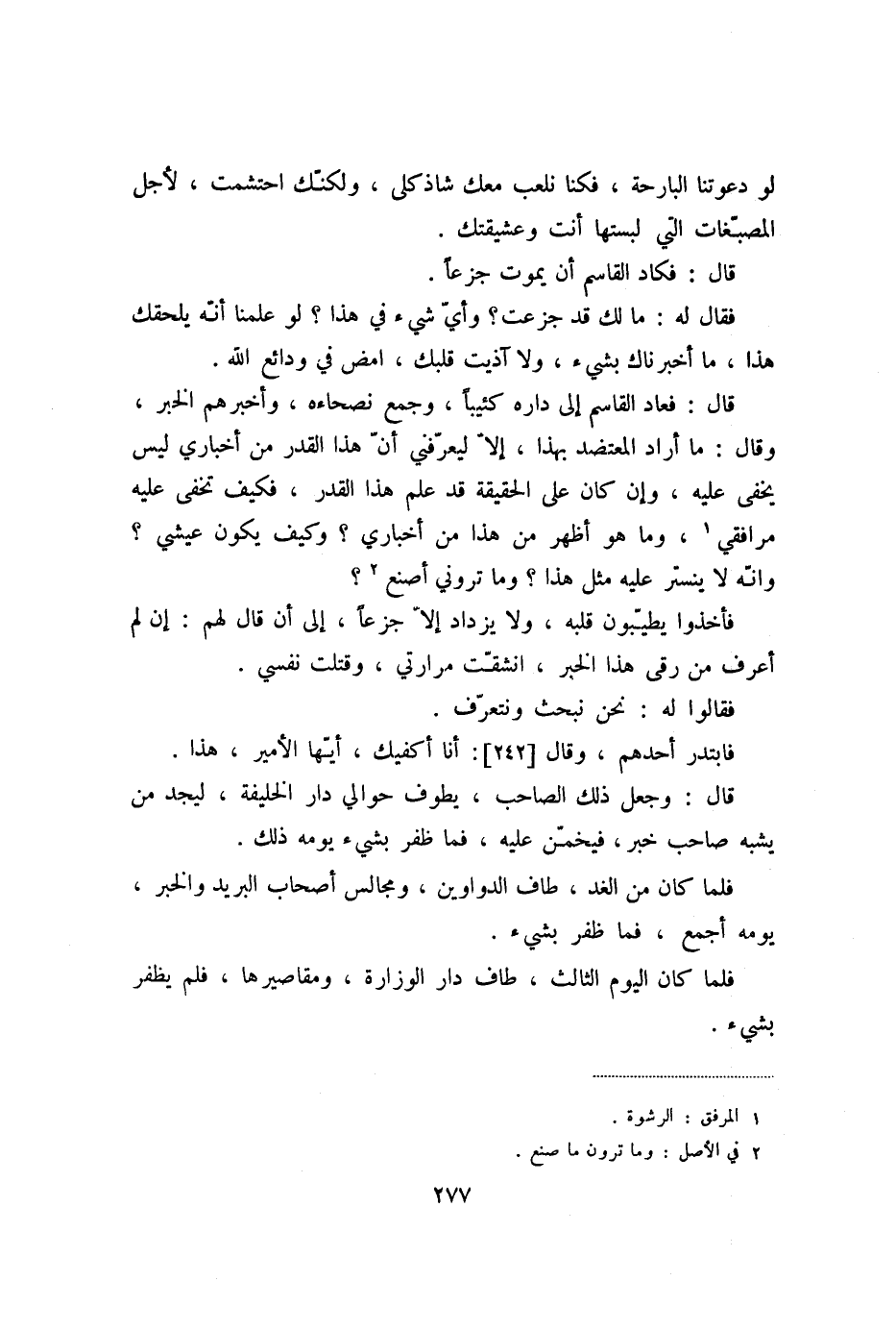 قال: فعاد القاسم إلى داره كئيبا، وجمع نصحاءه، وأخبرهم الخبر، وقال: ما أراد المعتضد بهذا، إلّا ليعرّفني أنّ هذا القدر من أخباري ليس يخفى عليه، وإن كان على الحقيقة قد علم هذا القدر، فكيف تخفى عليه مرافقي «1» ، وما هو أظهر من هذا من أخباري؟ وكيف يكون عيشي؟