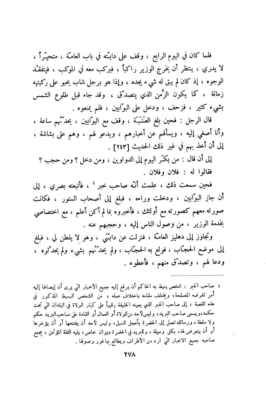 إلى أن قال: من بكّر اليوم إلى الدواوين، ومن دخل؟ ومن حجب؟