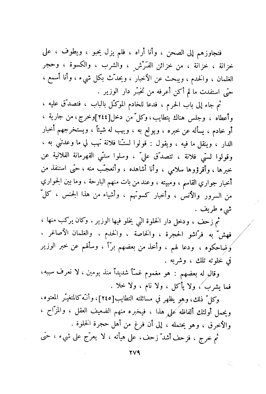 فتجاوزهم إلى الصحن، وأنا أراه، فلم يزل يحبو، ويطوف، على خزانة، خزانة، من خزائن الفرش، والشرب، والكسوة، وحجر الغلمان، والخدم، ويبحث عن الأخبار، ويحدّث بكل شيء، وأنا أسمع، حتى استفدت ما لم أكن أعرفه من تخبّر دار الوزير.