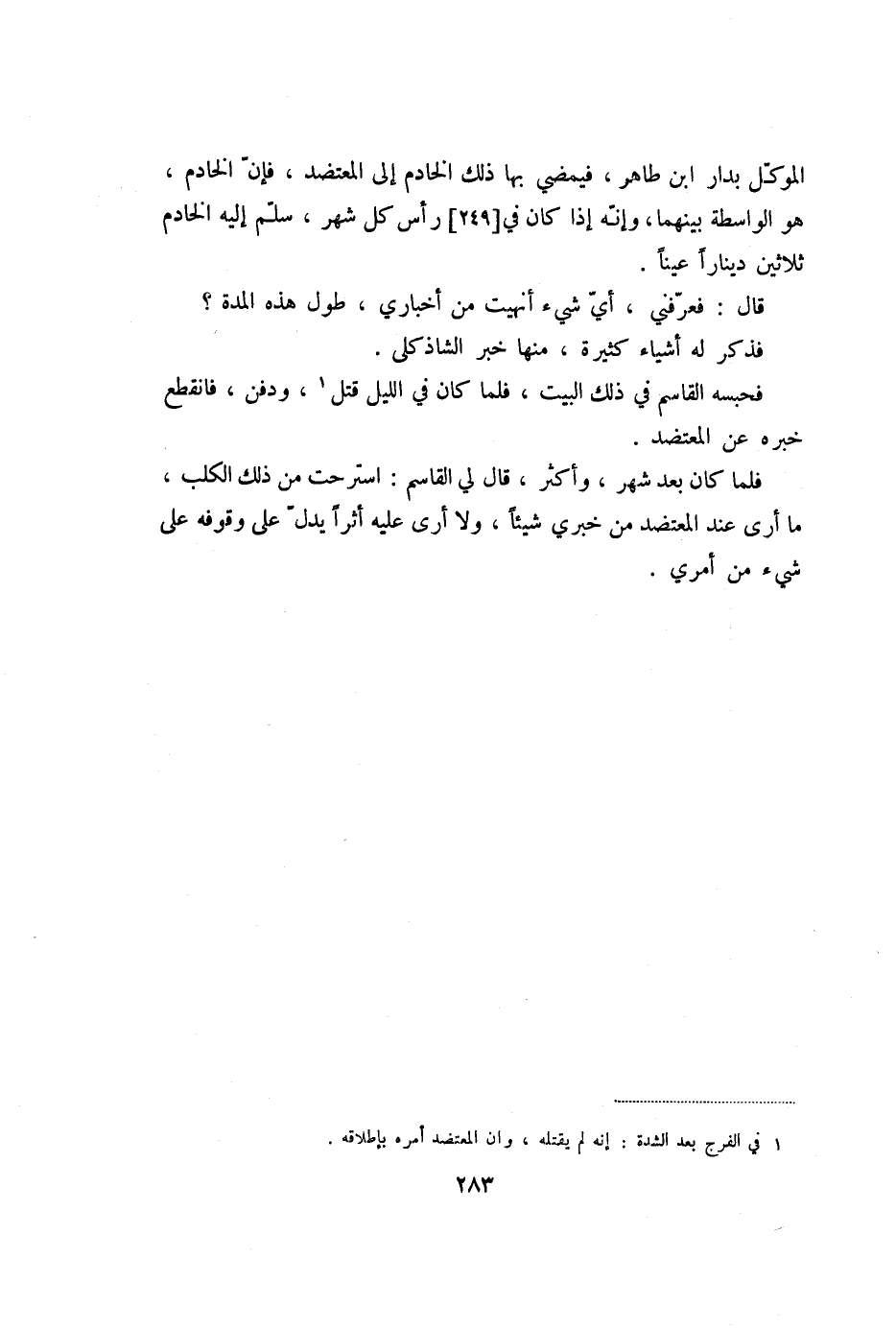 الموكّل بدار ابن طاهر، فيمضي بها ذلك الخادم إلى المعتضد، فإنّ الخادم، هو الواسطة بينهما، وإنّه إذا كان في [249] رأس كل شهر، سلّم إليه الخادم ثلاثين دينارا عينا.