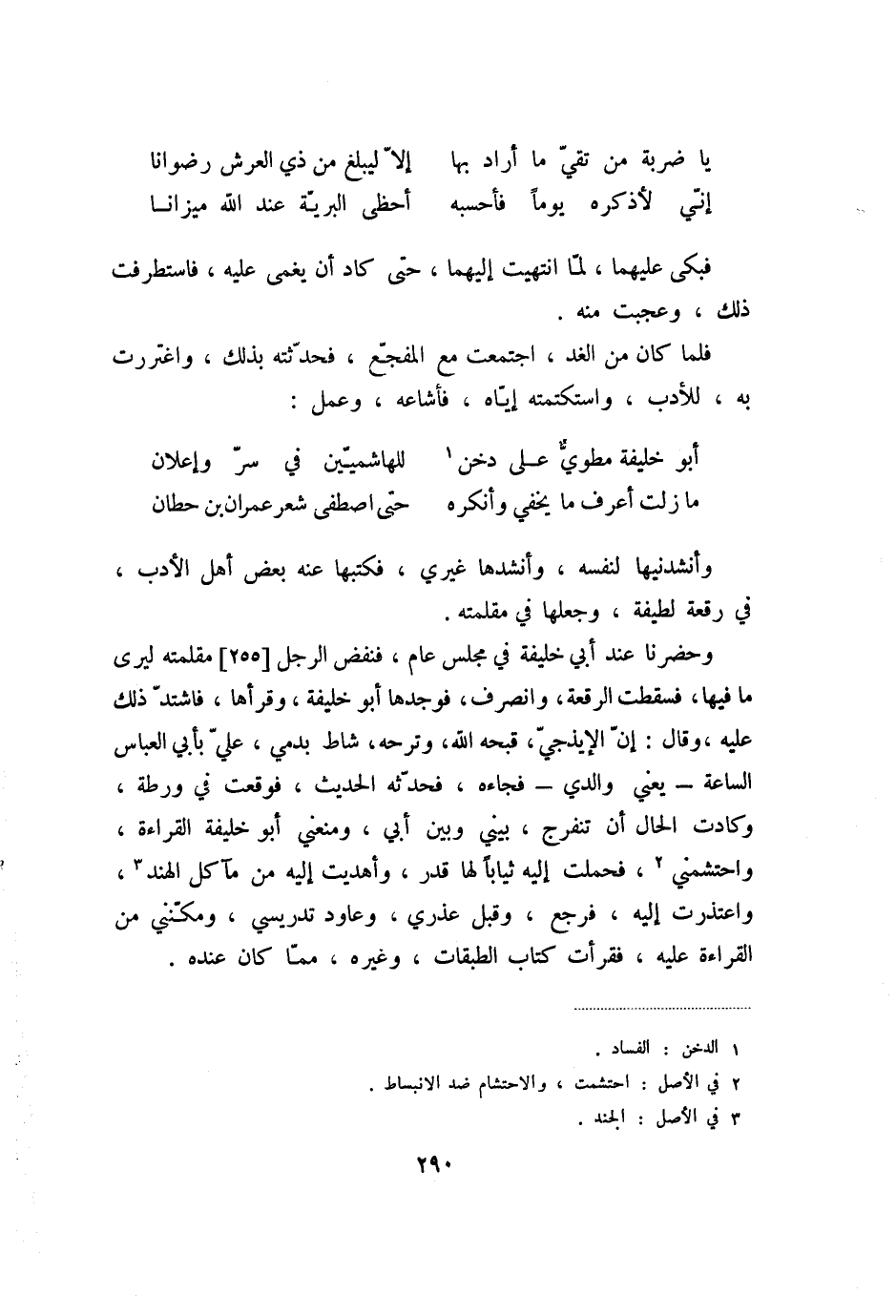 وحضرنا عند أبي خليفة في مجلس عام، فنفض الرجل [255] مقلمته ليرى ما فيها، فسقطت الرقعة، وانصرف، فوجدها أبو خليفة، وقرأها، فاشتدّ ذلك عليه، وقال: إنّ الإيذجيّ، قبحه الله، وترحه، شاط بدمي، عليّ بأبي العباس الساعة- يعني والدي- فجاءه، فحدّثه الحديث، فوقعت في ورطة، وكادت الحال أن تنفرج، بيني وبين أبي، ومنعني أبو خليفة القراءة، واحتشمني «2» ، فحملت إليه ثيابا لها قدر، وأهديت إليه من مآكل الهند «3» ، واعتذرت إليه، فرجع، وقبل عذري، وعاود تدريسي، ومكّنني من القراءة عليه، فقرأت كتاب الطبقات، وغيره، ممّا كان عنده.