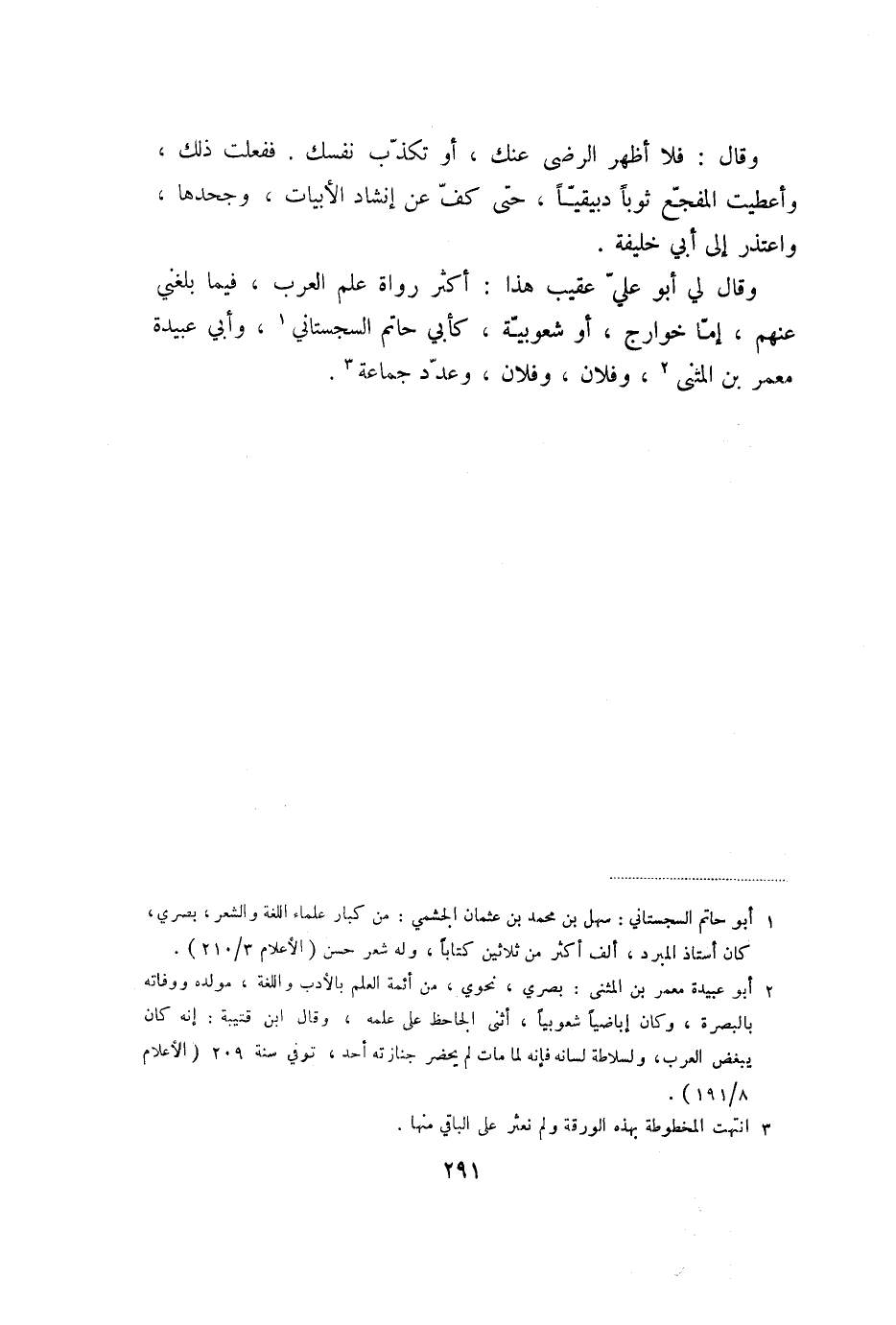 وقال لي أبو عليّ عقيب هذا: أكثر رواة علم العرب، فيما بلغني عنهم، إمّا خوارج، أو شعوبيّة، كأبي حاتم السجستاني «1» ، وأبي عبيدة معمر بن المثنى «2» ، وفلان، وفلان، وعدّد جماعة «3» .
