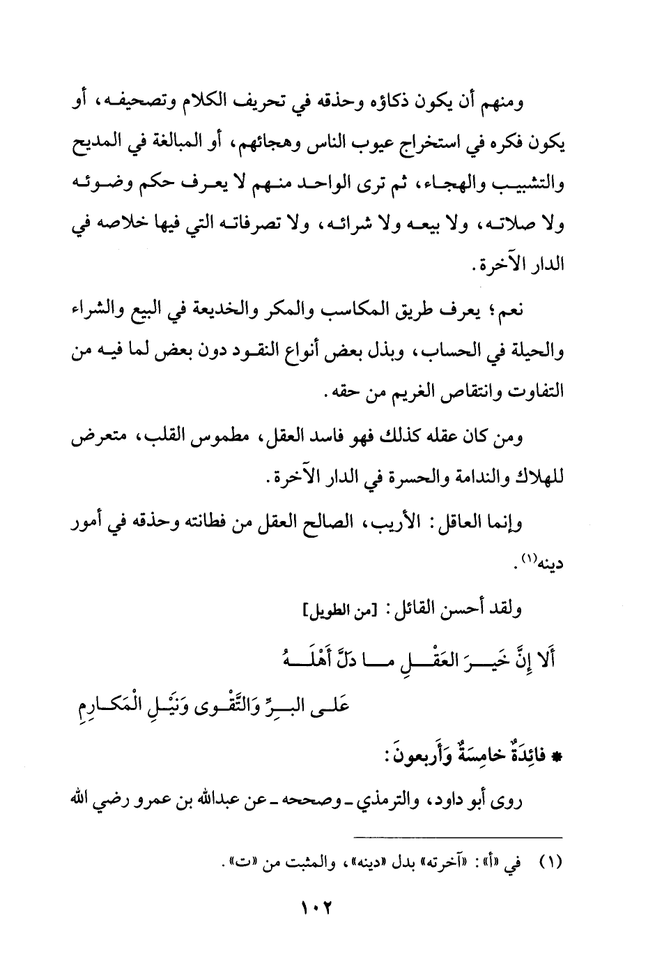 أَلا إِنَّ خَيرَ العَقْلِ ما دلَّ أَهْلَهُ ... عَلى البِرِّ وَالتَّقْوى وَنيْلِ الْمَكارِمِ