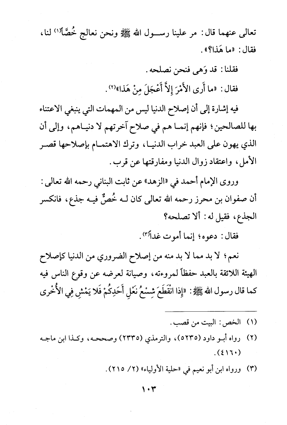 وروى الإمام أحمد في "الزهد" عن ثابت البناني رحمه الله تعالى: أن صفوان بن محرز رحمه الله تعالى كان له خُصٌّ فيه جذع، فانكسر الجذع، فقيل له: ألا تصلحه؟