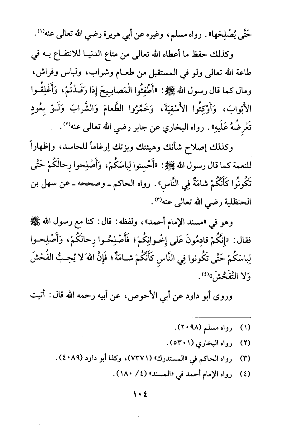 وكذلك إصلاح شأنك وهيئتك وبزتك إرغاماً للحاسد، وإظهاراً للنعمة كما قال رسول الله - صلى الله عليه وسلم -: " أَحْسِنوا لِباسَكُمْ، وَأَصْلِحوا رِحالَكُمْ حَتَّى تَكُونُوا كَأَنَّكُمْ شامَةٌ فِي النَّاسِ". رواه الحاكم - وصححه - عن سهل بن الحنظلية رضي الله تعالى عنه (¬3).