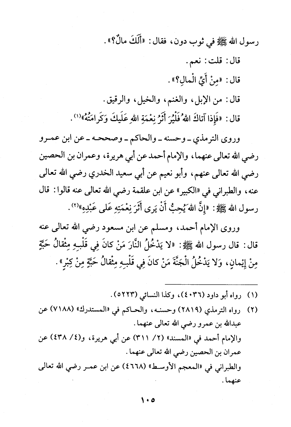 وروى الترمذي - وحسنه - والحاكم - وصححه - عن ابن عمرو رضي الله تعالى عنهما، والإمام أحمد عن أبي هريرة، وعمران بن الحصين رضي الله تعالى عنهم، وأبو نعيم عن أبي سعيد الخدري رضي الله تعالى عنه، والطبراني في " الكبير " عن ابن علقمة رضي الله تعالى عنه قالوا: قال رسول الله - صلى الله عليه وسلم -: " إِنَّ الله يُحِبُّ أَنْ يَرى أثَرَ نِعْمَتِهِ عَلى عَبْدِهِ" (¬2).