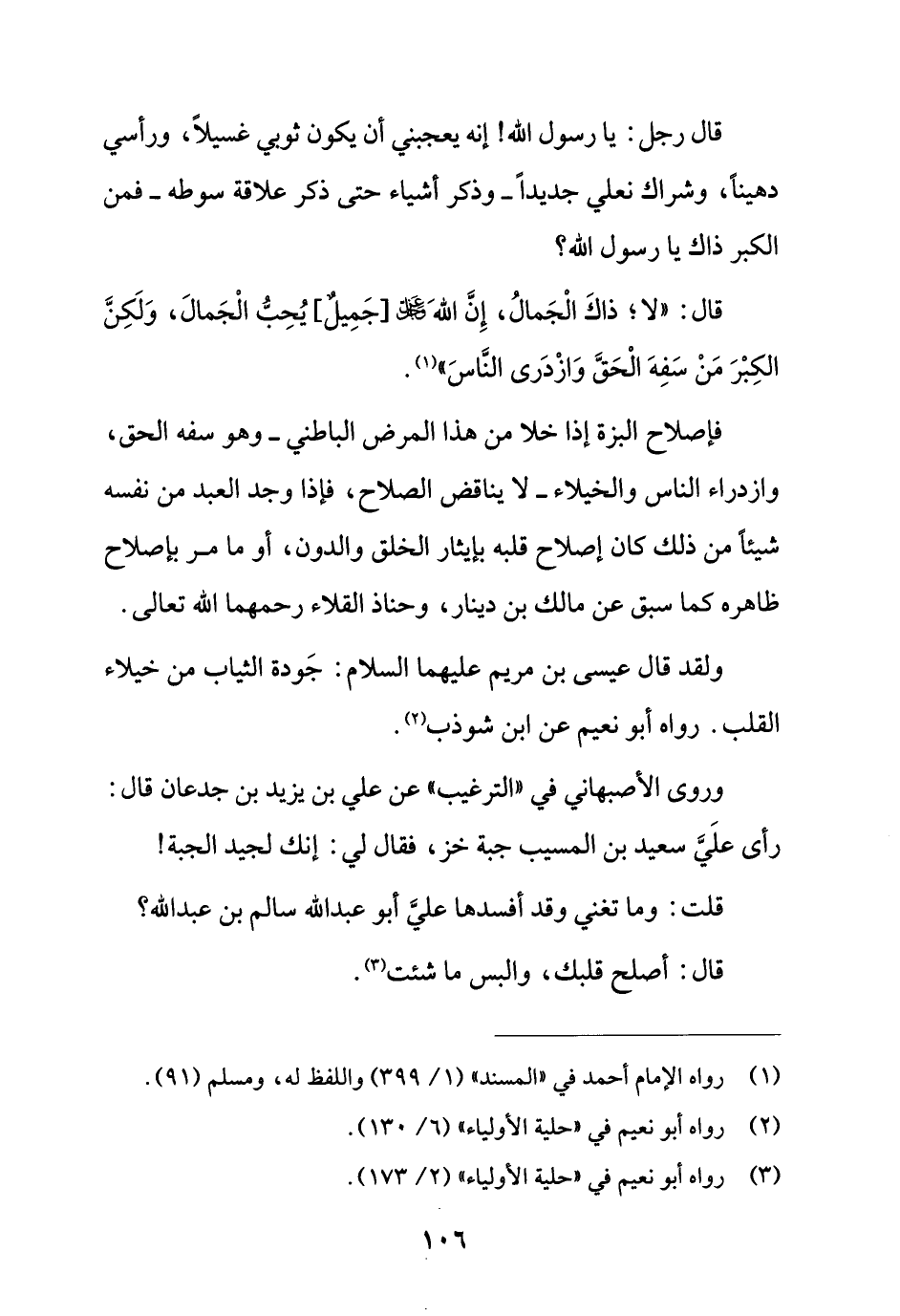 قال: "لا؛ ذاكَ الْجَمالُ، إِنَّ اللهَ عز وجل [جَمِيلٌ] يُحِبُّ الْجَمالَ، وَلَكِنَّ الكِبْرَ مَنْ سَفِهَ الحَقَّ وَازْدَرى النَّاسَ" (¬1).
