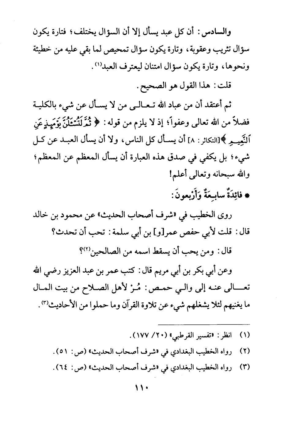 ثم أعتقد أن من عباد الله تعالى من لا يسأل عن شيء بالكلية فضلاً من الله تعالى وعفواً؛ إذ لا يلزم من قوله: {ثُمَّ لَتُسْأَلُنَّ يَوْمَئِذٍ عَنِ النَّعِيمِ} [التكاثر: 8] أن يسأل كل الناس، ولا أن يسأل العبد عن كل شيء؛ بل يكفي في صدق هذه العبارة أن يسأل المعظم عن المعظم؛ والله سبحانه وتعالى أعلم!