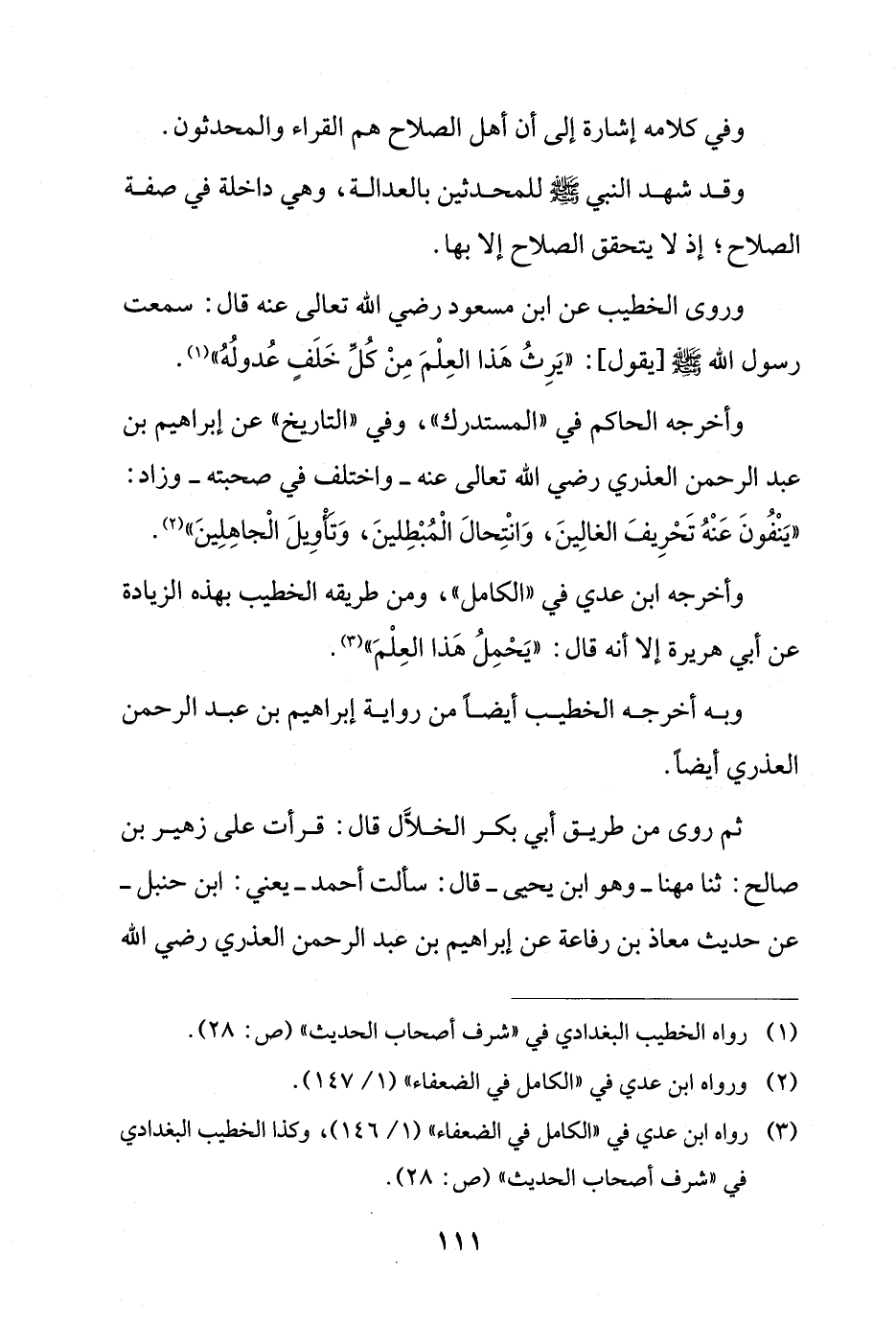 وروى الخطيب عن ابن مسعود رضي الله تعالى عنه قال: سمعت رسول الله - صلى الله عليه وسلم -[يقول]: "يَرِثُ هَذا العِلْمَ مِنْ كُلِّ خَلَفٍ عُدولُهُ " (¬1).