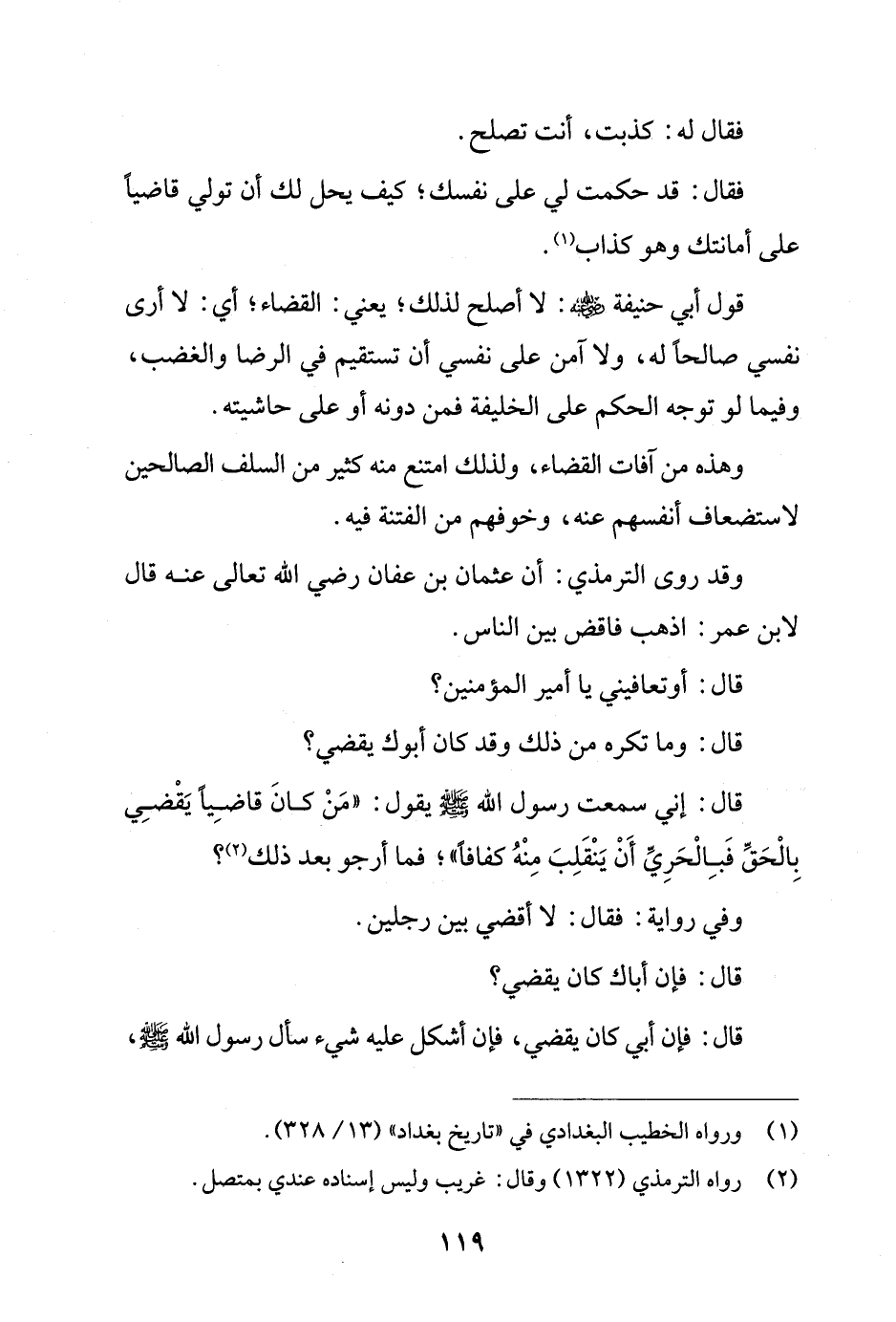 وقد روى الترمذي: أن عثمان بن عفان رضي الله تعالى عنه قال لابن عمر: اذهب فاقض بين الناس.
