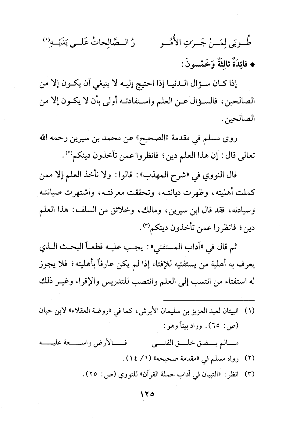 روى مسلم في مقدمة " الصحيح " عن محمد بن سيرين رحمه الله تعالى قال: إن هذا العلم دين؛ فانظروا عمن تأخذون دينكم (¬2).