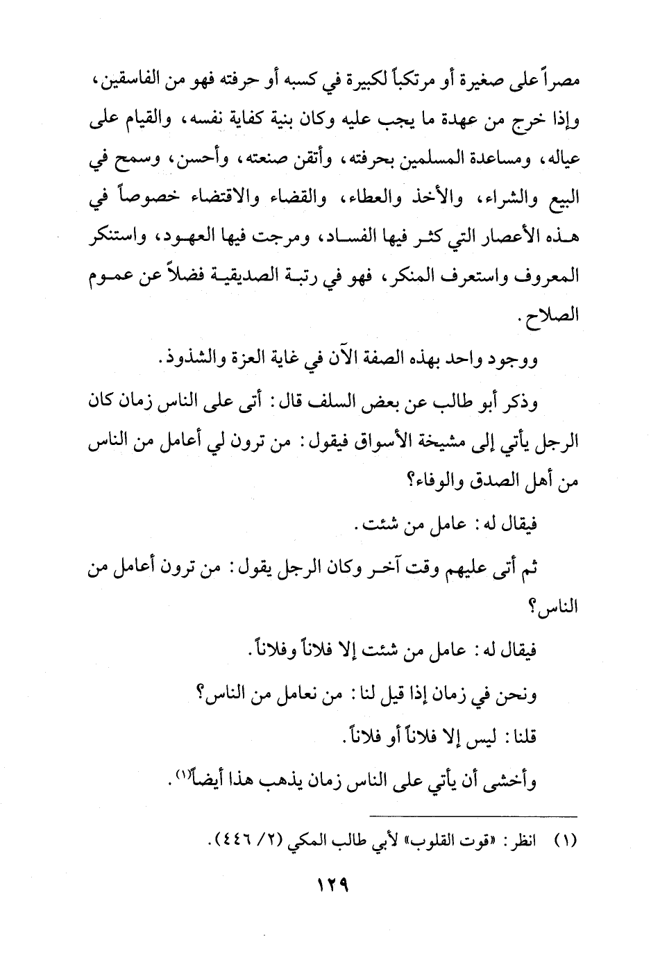 وذكر أبو طالب عن بعض السلف قال: أتى على الناس زمان كان الرجل يأتي إلى مشيخة الأسواق فيقول: من ترون لي أعامل من الناس من أهل الصدق والوفاء؟