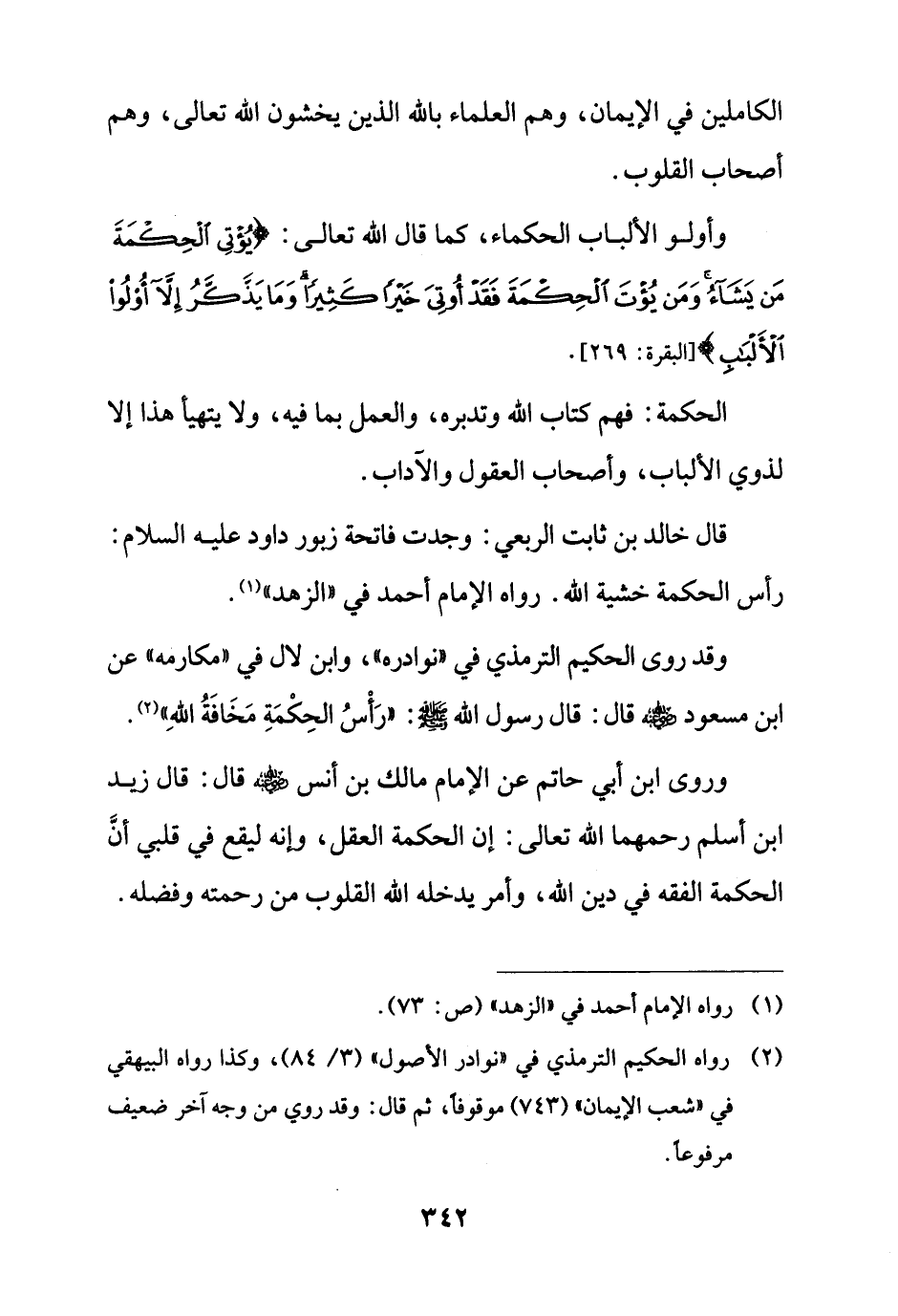 وروى ابن أبي حاتم عن الإِمام مالك بن أنس - رضي الله عنه - قال: قال زيد ابن أسلم رحمهما الله تعالى: إن الحكمة العقل؛ لأنه ليقع في قلبي أنَّ الحكمة الفقه في دين الله، وأمر يدخله الله القلوب من رحمته وفضله.