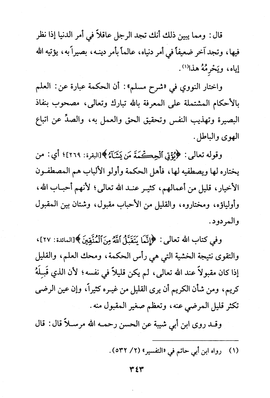 وفي كتاب الله تعالى: {إِنَّمَا يَتَقَبَّلُ اللَّهُ مِنَ الْمُتَّقِينَ} [المائدة: 27]، والتقوى نتيجة الخشية التي هي رأس الحكمة، ومحك العلم، والقليل إذا كان مقبولاً عند الله تعالى، لم يكن قليلاً في نفسه؛ لأن الذي قَبِلَهُ كريم، ومن شأن الكريم أن يرى القليل من غيره كثيرًا، وإن عين الرضى تكثر قليل المرضي عنه، وتعظم صغير المقبول منه.