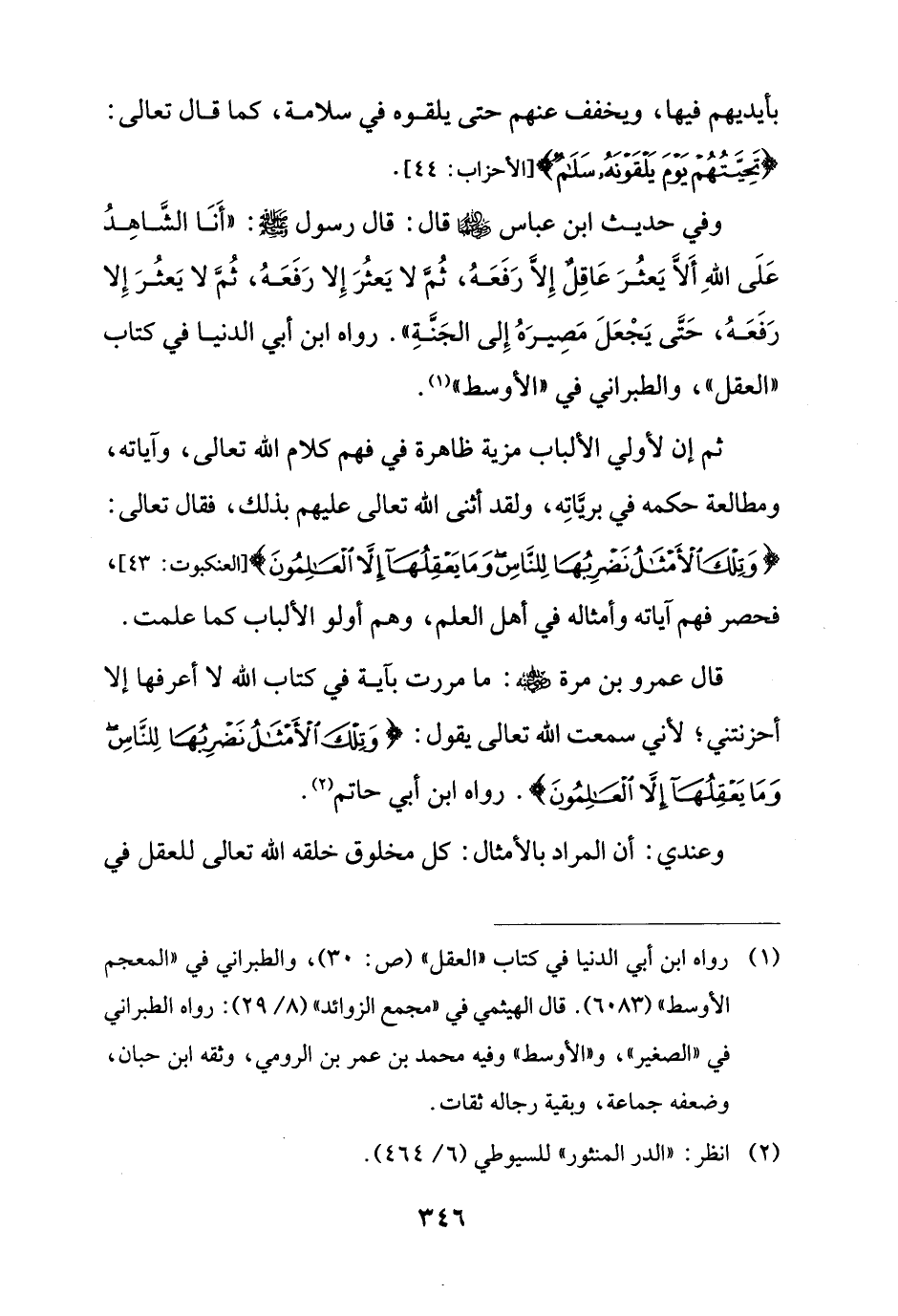 قال عمرو بن مرة - رضي الله عنه -: ما مررت بآية في كتاب الله لا أعرفها إلا أحزنتني؛ لأني سمعت الله تعالى يقول: {وَتِلْكَ الْأَمْثَالُ نَضْرِبُهَا لِلنَّاسِ وَمَا يَعْقِلُهَا إِلَّا الْعَالِمُونَ}. رواه ابن أبي حاتم (¬2).